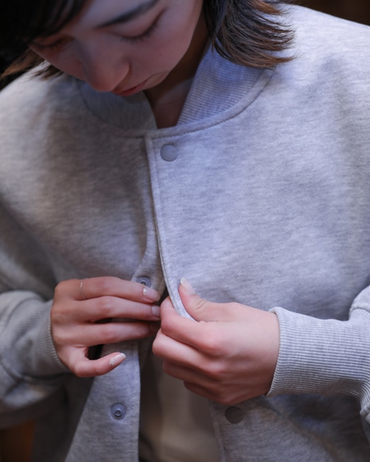 サイドに伸縮性のあるフライス地を仕様したシンプルなスナップカーディガンはゆったりとしたシルエットですが、