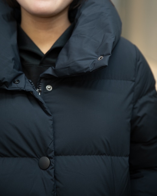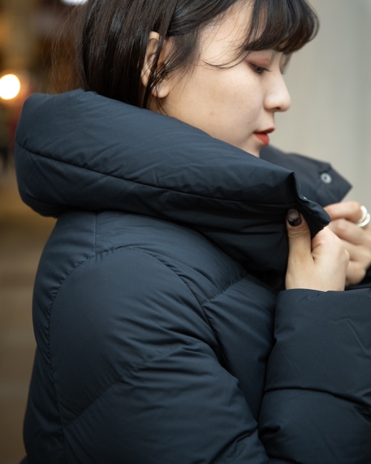 フレンチダックダウンをしっかりと詰め立体的に仕上げた襟は、一番上のボタンを閉じることで襟が立ち上がりマフラー代わりにもなります。
