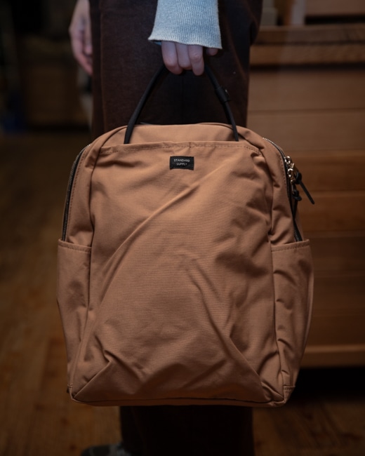 仕様については、バッグの持ち手は自立しているので持ちやすく、ホックで束ねることが可能。