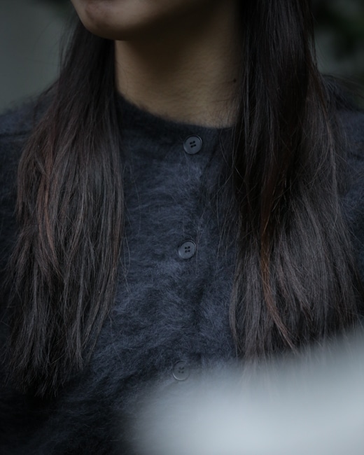 ATONより女性ならではのコンパクトなボディバランスの衿付きカーディガン。