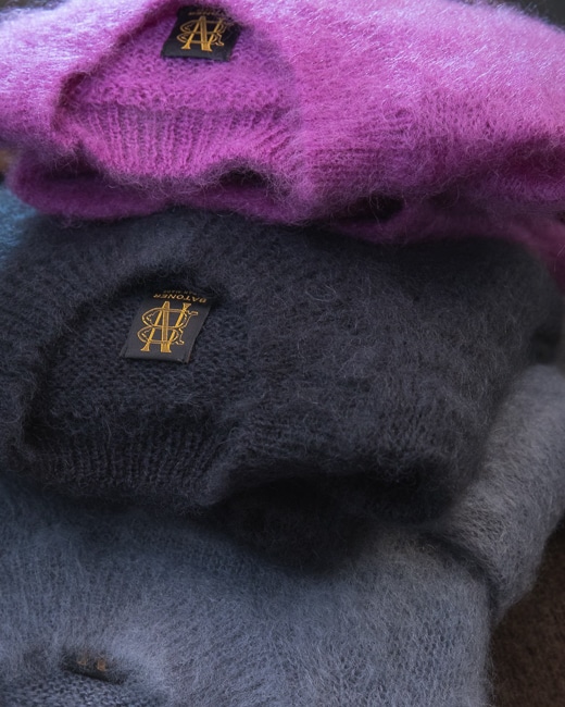 純粋なモヘヤ100%の風合いが最大限に生かされた光沢感、なめらかな肌触りはBATONERならではの技。