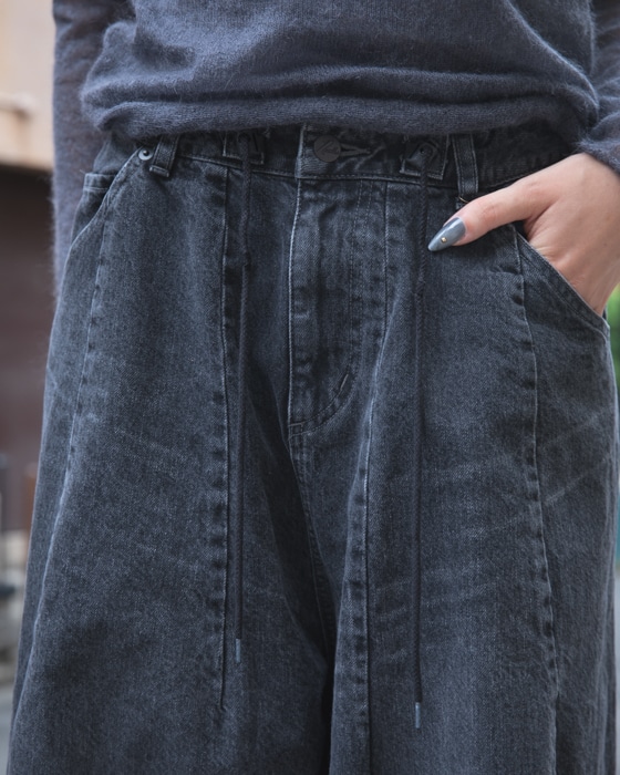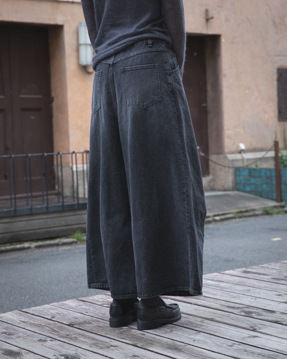 ダーツ処理によって生まれる独特の個性的なシルエットのパンツは、ボリューム感をさらに強調した一本。
