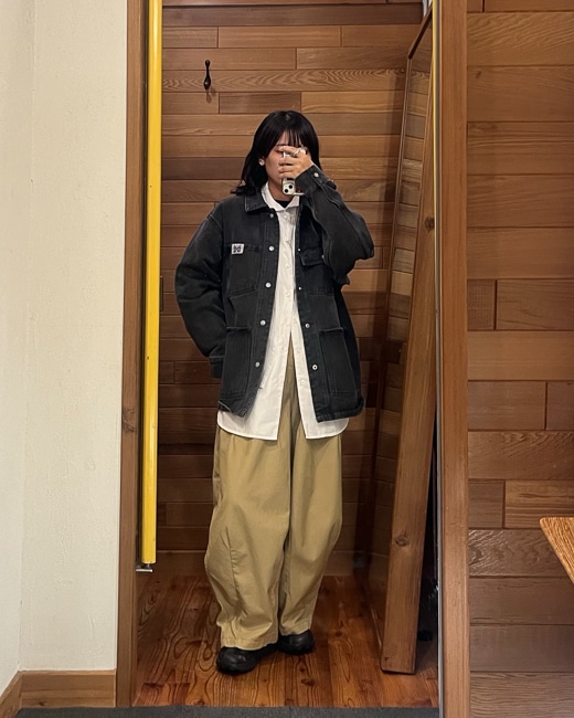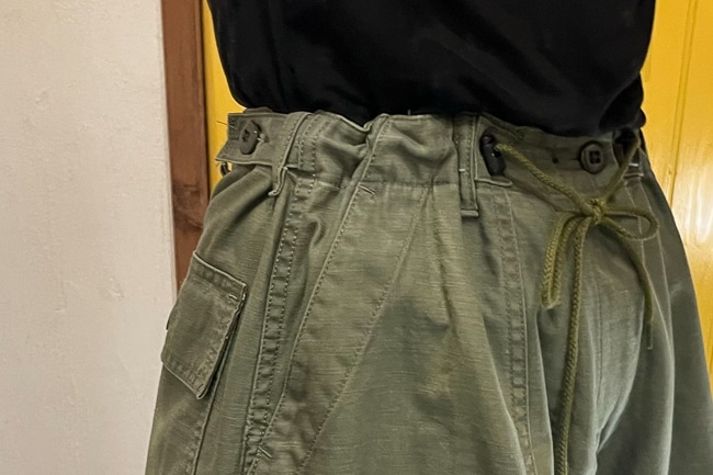 他のモデルに比べて丈感は若干短め、ドローコードに加え、サイドベルトが付いているのでウエストも、1番細めな印象でした。色褪せが楽しみになる一本。