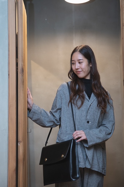 今回はレザー小物と合わせて、キレイめカジュアルスタイルに。