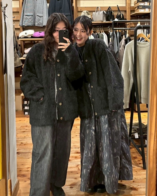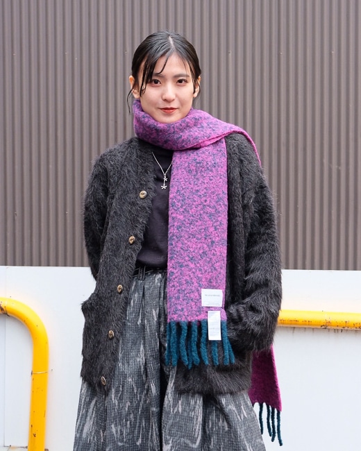 冒頭の写真、ピンク色のマフラーに目を惹かれますが、まず見ていただきたいのはカーディガンの方。