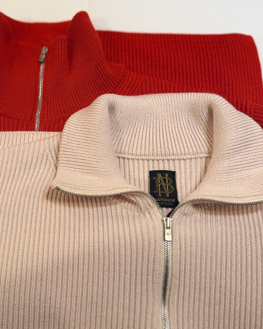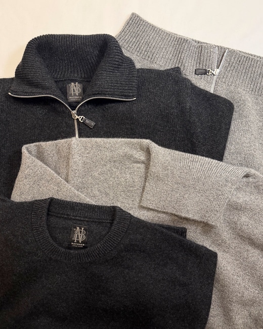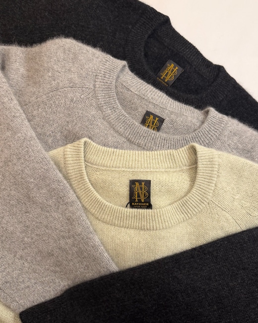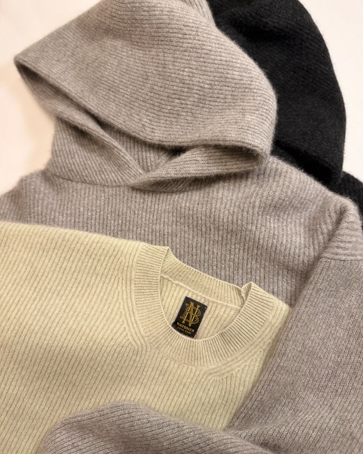 その年の毛質の平均繊度が最も高く均一なクオリティーの地域の毛を採取し、常に最上級のクオリティーコントロールがなされ、風合いと編み目の美しさを追求したイノセントカシミヤ。ダブルジップのドライバーズニット。タートルネック。クルーネックと種類豊富にご用意。