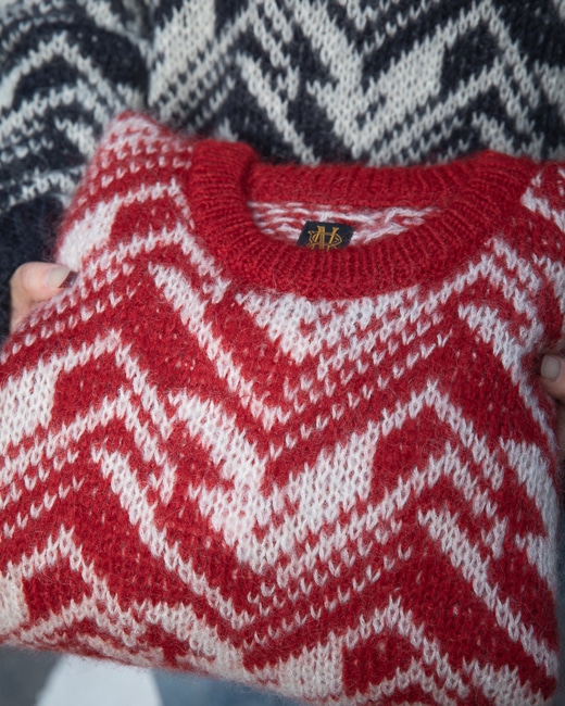 スーパーキッドモヘアと、メリノウールをブレンドした太番手の糸をローゲージでジャガード編みに。山形の雪深い風景をモチーフに冬の山々をイメージした幾何学模様があしらわれています。