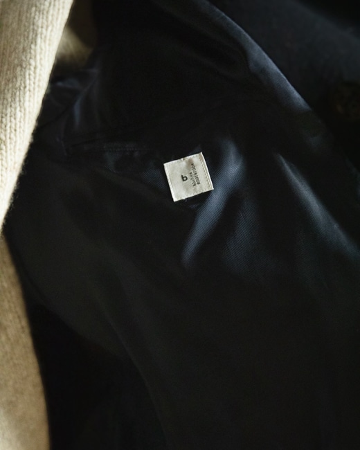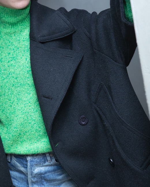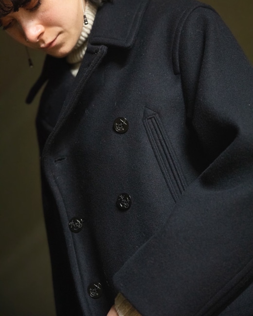 こちらは、上品な艶感のあるラムウールのメルトン生地を使用したコート。ピーコートらしくボタンには錨マークが付いています。