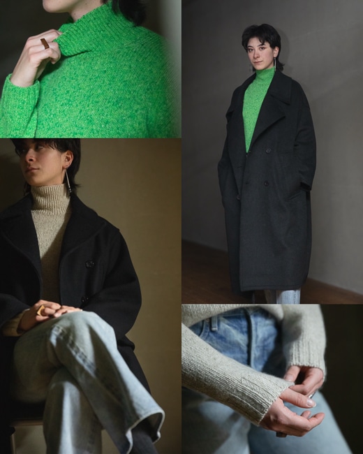 繊細で柔らかなカシミヤニットに、重厚感のあるウールのコートを。