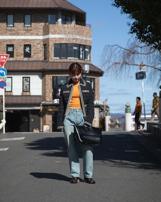 今回は、春らしくオレンジ色のAURALEEのシアートップスと淡色のHERILLのデニムと合わせてみました。