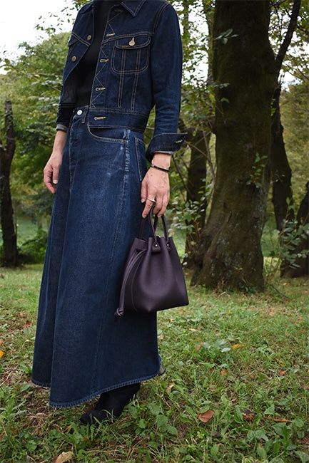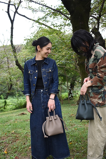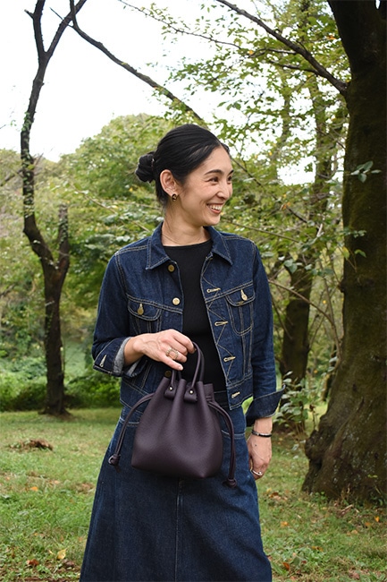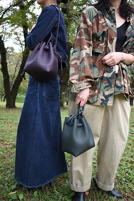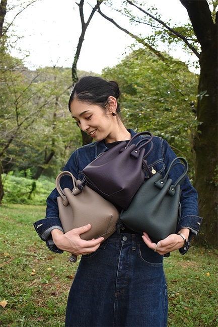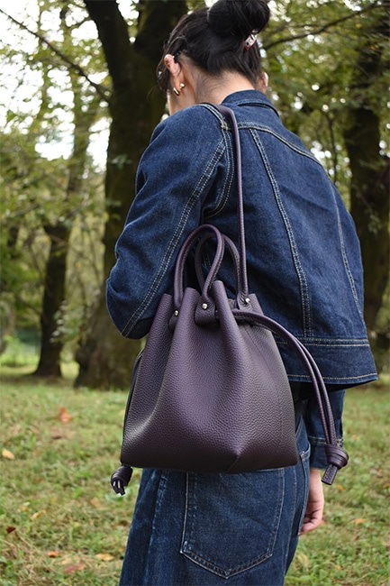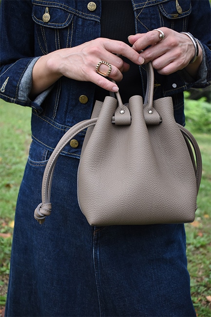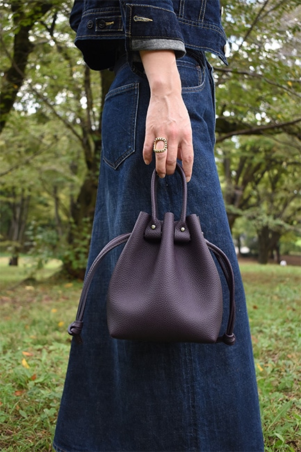 今回ご用意したのは、ブランドでも人気の高い巾着型Petit Tresor (プティトレゾール)を2年振りに別注したもの。使用している革はドイツシュリンク。「2年間制作スタッフとして携わっていたブランドの時からずっと気に入っていて、そのブランドでも使っていました。分厚いけどしなやかで、薄い革だと角張った感じになりますが、ドイツシュリンク特有の厚みを生かし、厚みがあるからこそ裏地無しでもコロンとした可愛らしいフォルムに仕上がります。」と、麻子さん談。堅牢で傷が目立ちにくく、雨の日でも気兼ねなく使える。そのうえ、使い込むほどに艶を増していく美しい革。巾着型というとレディースの印象が強いかもしれませんが、麻子さんの作るモノは違う。女性ならではの繊細さと丁寧さに加え、力強さのあるステッチワークが光る。メンズのスタイルにも自然に馴染む仕上がりに。