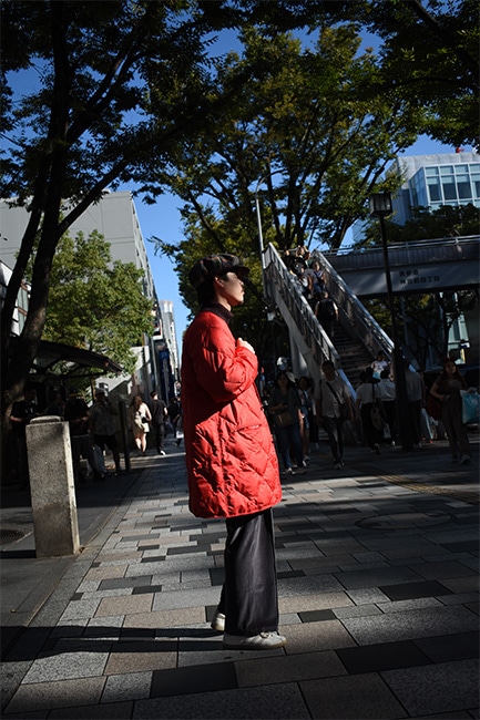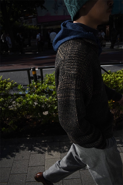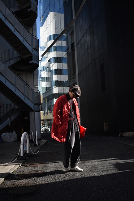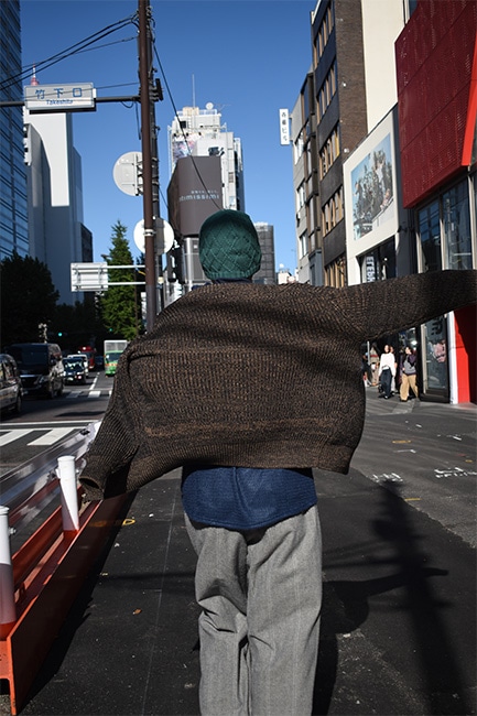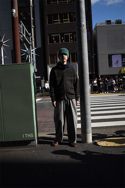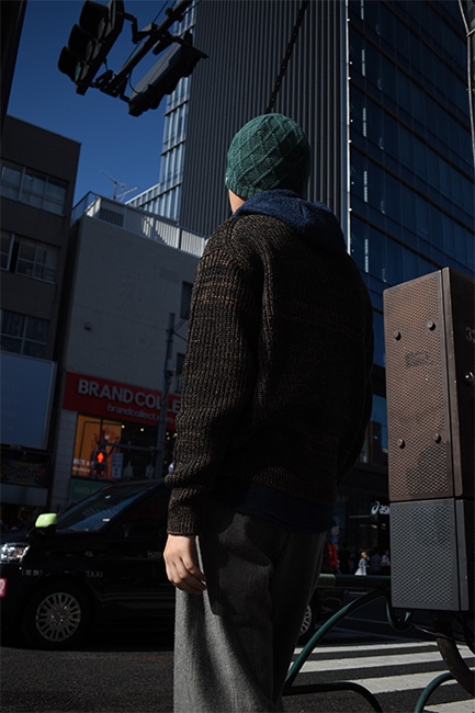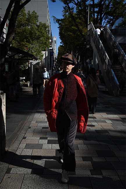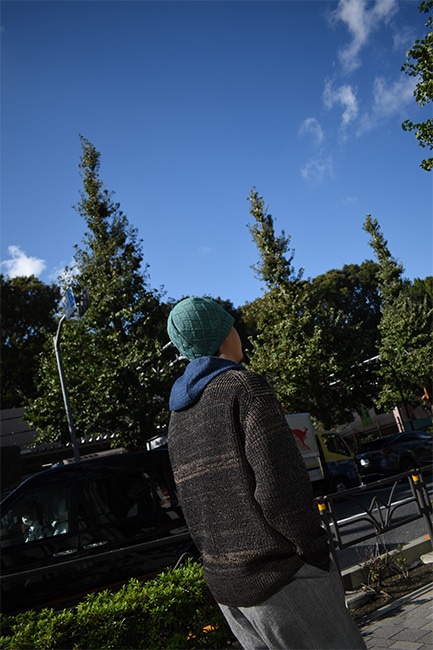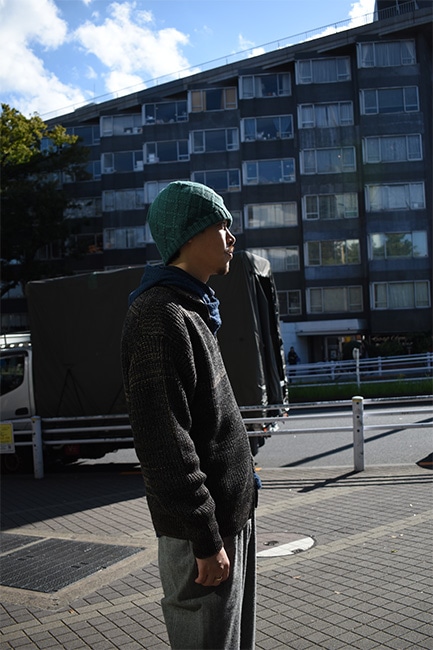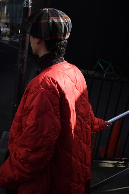 まあ、普通に届いた瞬間に衝撃を受けましたね。これがメーカーさんの言っていた一つ一つの表情が全く違うやつかと。とりあえず全て広げて本当に全部違うのかを確認しました。ネイビーの主張がしっかりしたやつや、オリーブの主張が弱めのやつとか、本当にそれぞれ違う表情をしていたので、これはお客さんと一緒に楽しみながら選べるなあって。モノとしても、今までに見た事のない感じで、一番最初の企画段階で聞いていたヴィンテージっぽい感じっていう言葉がピッタリだなって。けれども、ヴィンテージには存在しない個体がそこにはありました。BATONERだけど、上品という感じよりかは、少しアバンギャルドな感じがしたので、様々なカルチャーが共存している原宿あたりで撮影をすれば雰囲気が合うんじゃないかなって勝手に思ったので撮ってきました。