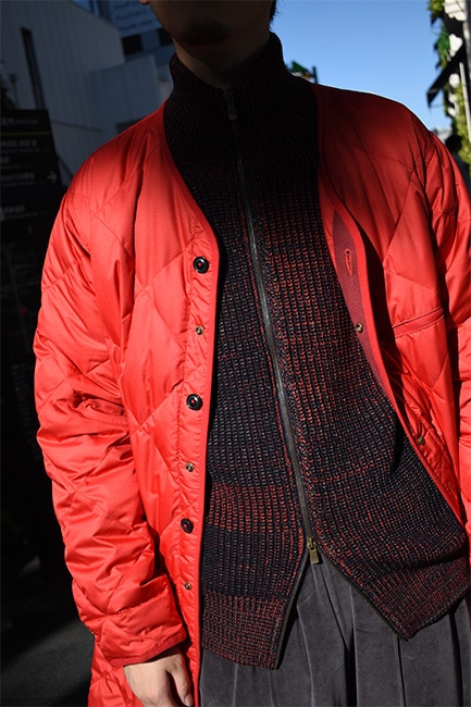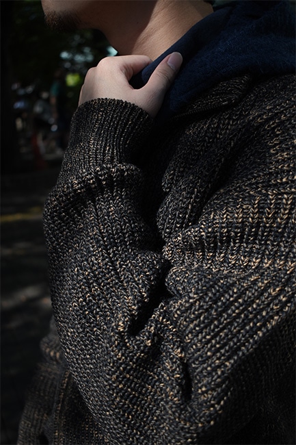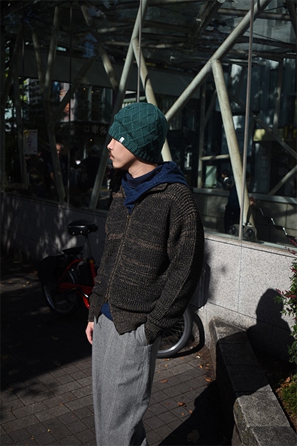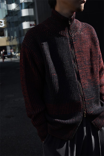 今まで沢山のBATONERのアイテムを見てきたけど、この面をしたモノは見たことがない。BATONERって聞いて思い浮かべるのは、プレーンなルックスだけど、生地は物凄く拘ったものという感じ。多分それは僕達だけではなく、お客様もそういったイメージをお持ちなはず。けれどもこれは違う。クラフト感凄くて、ハンドならではの手仕事の温もりを感じられる新しい顔を見せてくれた。サンプルを制作している真っ只中に、メーカーさんが一度東京店に来てくださった事があり、今回のこの別注に関して少しお話しをしました。「なんか、今までに見た事の無い感じで上がってきたんですけど、大丈夫ですかね。ヴィンテージ感のある雰囲気っていうのは掴めたんですけど、一つ一つの物が違いすぎて商品に出来ないような気がしていたんです。けれども、逆にそれを良いと仰って下さったんでそのまま進行している最中です。」と聞いた時は、どんなものが来るのかと思っていましたが、本当に凄いのが届きました。ブランドの中では絶対的に初めてのアソートニットブルゾン。7本の糸を撚り合わせた中で1本1本の色を変更した手の混み具合が半端じゃないニットブルゾン。