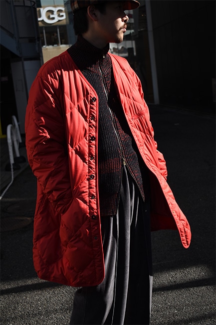 本来、ブランドオリジナルのシルバーのジップに、BATONERのロゴが刻印されたモノなのですが、今回の別注には刻印なしの銅色のジップを採用。多分これがよりヴィンテージ顔を引き立たせる要因の一つ。写真で着用している個体は、右側はかなりネイビー強め、左はレッドが強めの感じ。こういった個体がたまに出てくるのがこの別注の面白いところでもある。