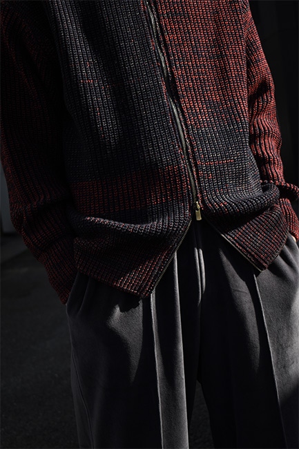 長年、手横編み機で制作しているBATONERの技術と、弊社スタッフの想いが偶然の産物として結実した一着。左右非対称のバランスと杢調の奥行きが織りなす表情は、狙って再現することは到底出来ません。だからこそ、一枚一枚が唯一無二であり、着る人のスタイルや空気感によって全く異なる印象を与えてくれます。