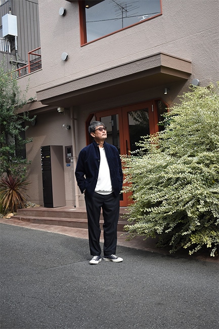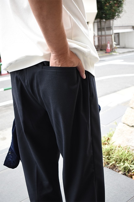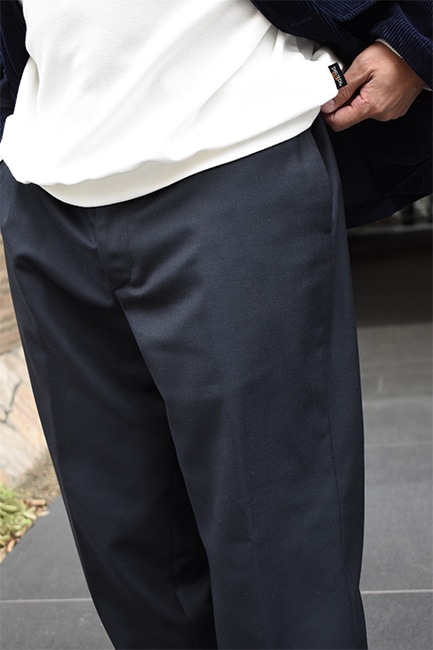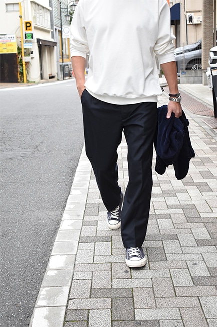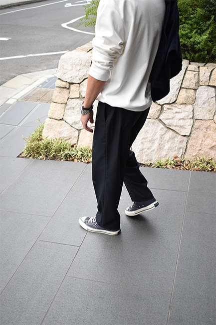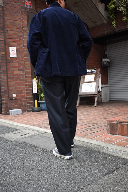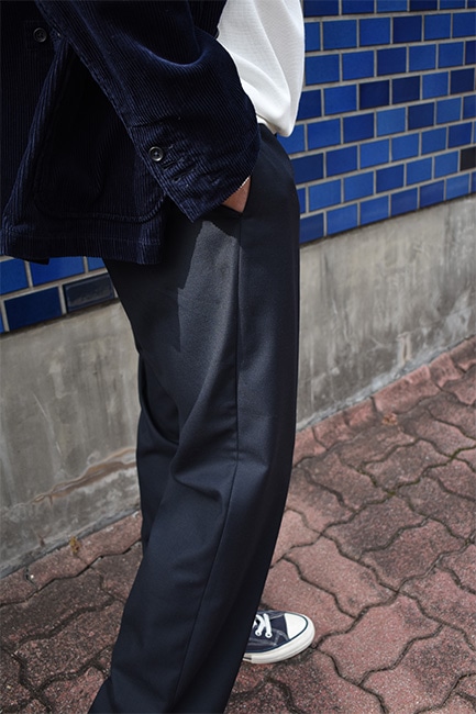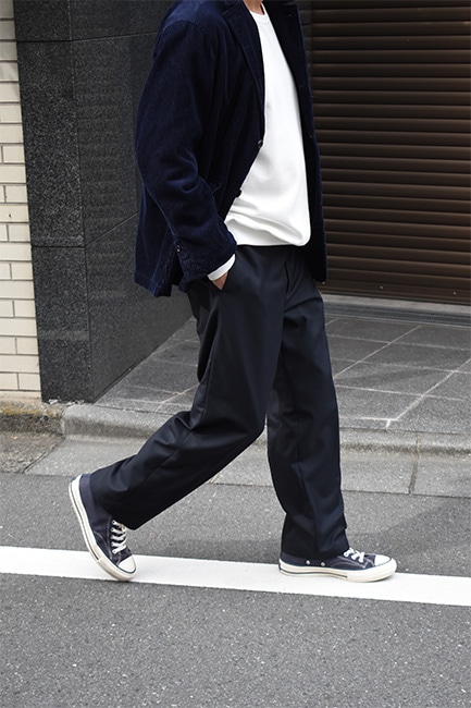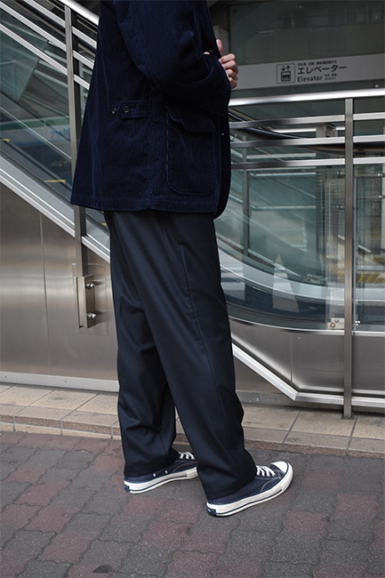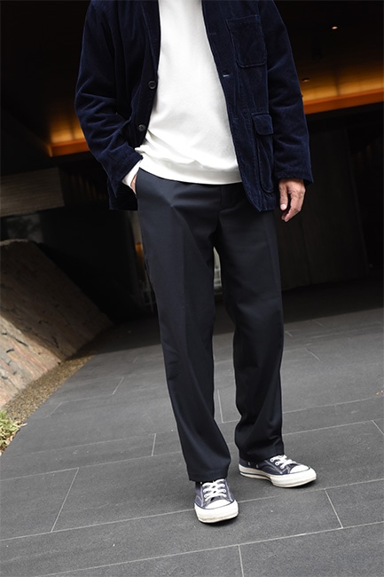 もはや説明不要の定番別注品であるLoose Easy Slacksが、今シーズンも到着。生地は、昨年展開していたウールポリのWool Thermoで、今年はネイビー。薄手でありながら、比較的寒い時期まで履けるこのWool Thermoは、発熱した空気を繊維間に取り込んで保温してくれる万能ファブリック。万能なのはそこだけではなく、自宅で洗濯も出来てしまうという点。洗濯表記的にはNGですが、ポリエステルの比率が高く、手洗いしたとしてもほとんど縮む事はありません。仕様としては、イージーウエスト、バックはシャーリング。ここまではいつもと変わりませんが、少しだけシルエットを改良。以前まで、股下から裾にかけての緩やかなテーパードシルエットでしたが、もっと緩やかになりました。ストレートまではいかないけど、テーパードしすぎていないこのバランス感が絶妙で、ハイカットのコンバースや、ブーツなどを履いた時に、綺麗にカポっと収まります。