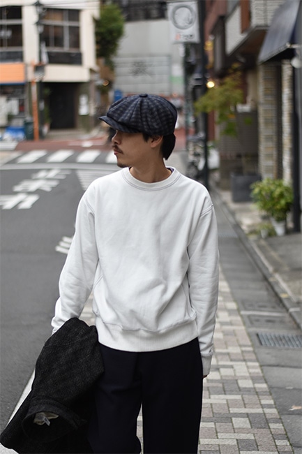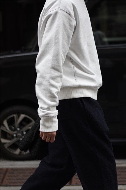 空前の古着ブームで、ヴィンテージスウェットも信じられないくらいに値段が高騰しています。着る為に買うというよりも投資のような感覚でそれらを買うという方も増えたからなんじゃないかなと。それも一つのカルチャーですし、否定はしません。ですが、僕らはセレクトショップの人間。新品にしか出来ない事をLOFTMAN TOKYOのフィルターを通してお客様に提案できればと思っています。そんな中で完成した今回の別注スウェットは、究極の日常着であり、ファッションとして見ても面白いものに仕上がりました。