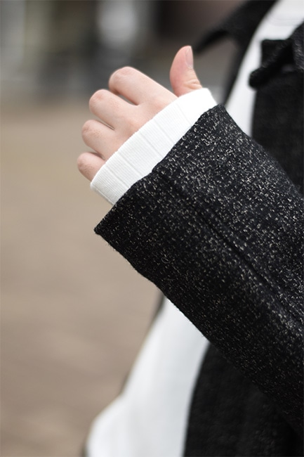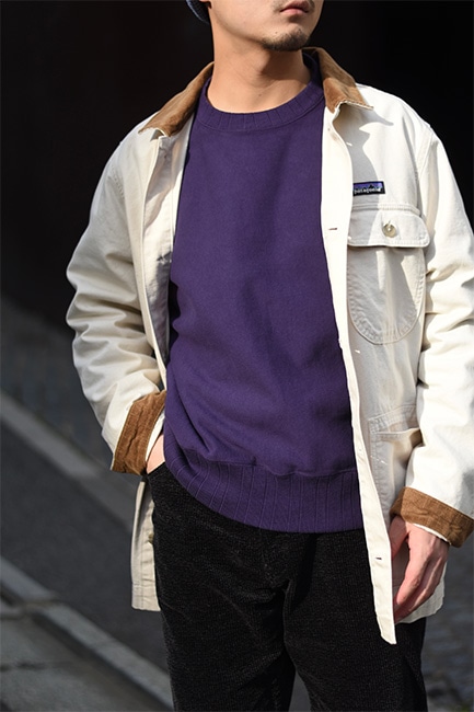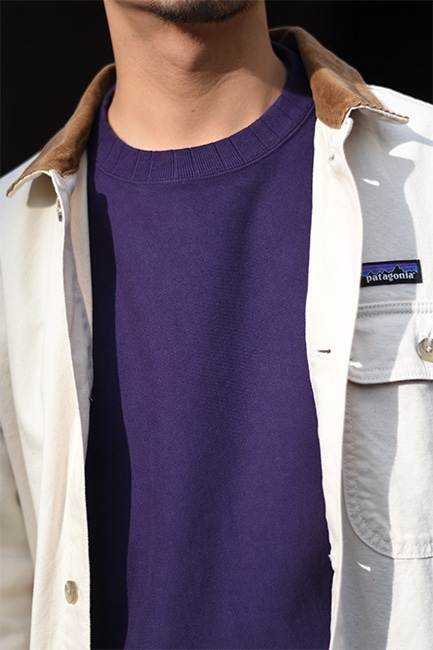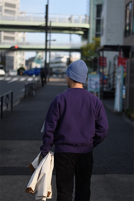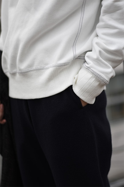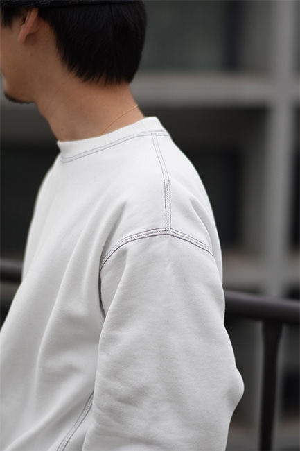 本来ならば、パープルとライムグリーンの2カラーを予定していたのですが、思わぬ展開に。生産の都合上、とりあえずシルエットだけ見るためにパープルに染める前のものを送って頂きました。そこで届いたものが今回リリースするホワイト。染めた時にステッチの色が浮かないようにパープルのステッチで縫製されており、これが僕達のドツボにハマっちゃいましたね。シンプルでクラシックなスウェットに遊び心のように加えられたステッチが良いギャップになっていて、偶然が産んだ面白いスウェットになりました。即答でこれが良いです!となり、ライムグリーンからホワイトに。狙った訳じゃないのに刺さるものが出来た感覚は初めてだったので、新鮮な気持ちでした。