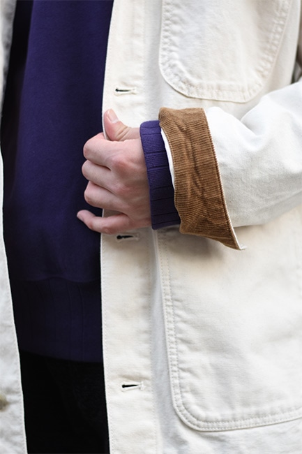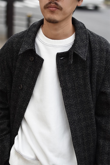 ここ数シーズンでブランドの定番になりつつあるJumberca Crew Neck 。ドイツの希少なジャンベルカという旧式織機を用いて、ゆっくりと度詰めに編み立てられた生地は大量生産のスウェットには無い上質な着心地。この生地がとにかく良い。外側はしっかりと目が詰まったハリのある生地感ですが、内側はふっくらとしたソフトな肌触り。それでいて軽い。文句の付け所が無いスウェット生地の最高峰です。ただ、色変更だけの別注はウチらしく無いなと思い、形・デザイン全てを1から作らせて頂きました。