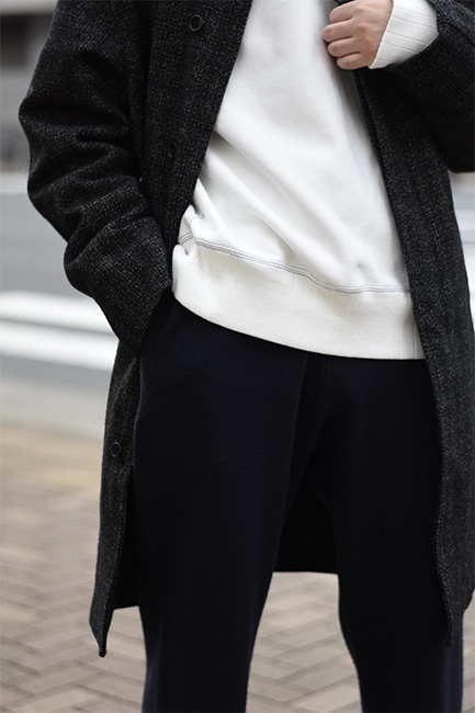 この前にリリースしたFilmelangeの別注ウールパンツやスウェットパンツなどに合わせて、ラフなのにキマるリラックスウェアとして着ても良いですし、よそ行きの洋服に合わせて、しっかりとスタイリングを組んでもすんなりと溶け込んでくれます。ファクトリーブランドだからこそ出来る、匿名性のあるスウェット。どんなに際どいアイテムでも受け入れられる懐の深さはBATONERにしか実現できません。LOFTMANに通って下さっている方も、初めて知る方も、このスウェットを通して僕達の提案を感じてもらえれば。