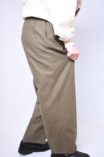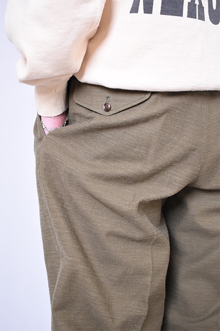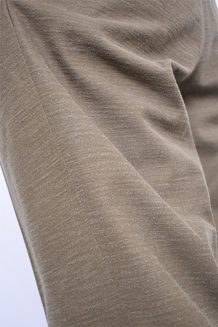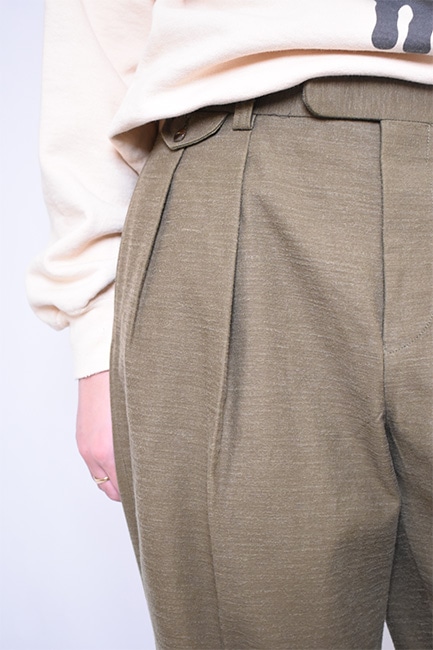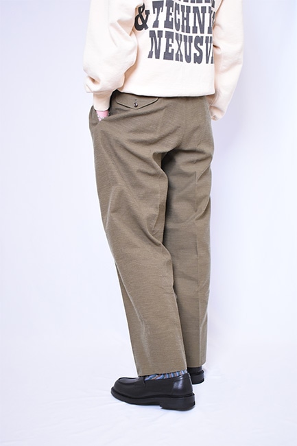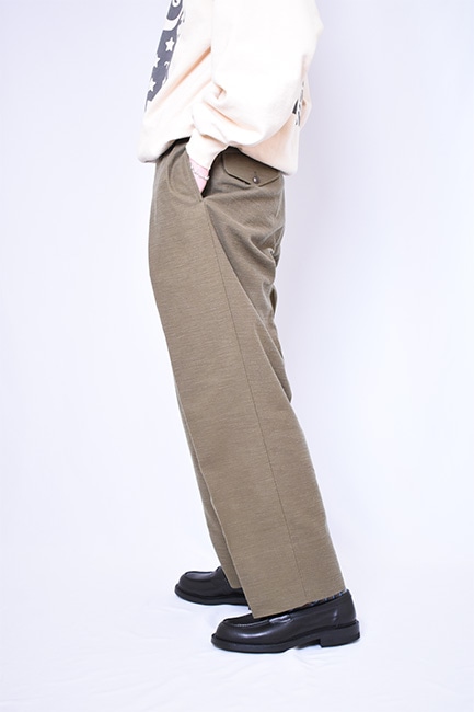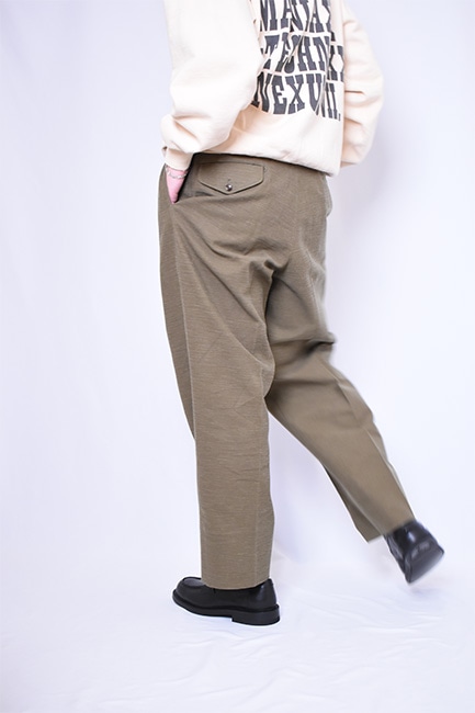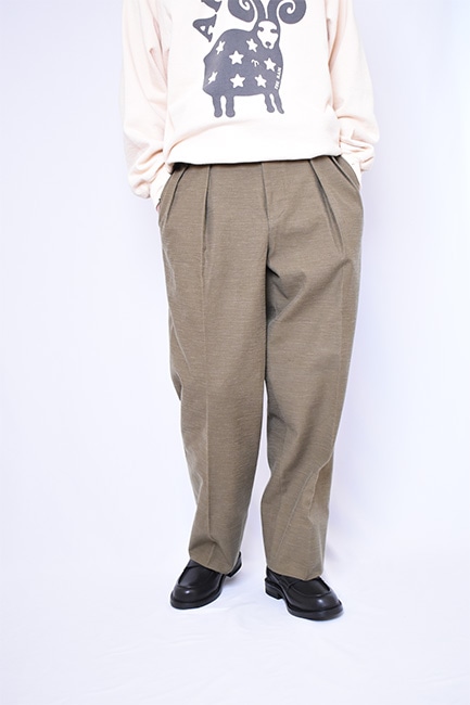 洋服にそこまで興味のない人でも知っているであろうブランドの80年代に出ていたウールのスラックスがベース。名前がLaurenceなので、勘の鋭い方は多分一瞬で分かるであろうあれから引っ張ってきたやつです。生地そのものを一度ガチッと硬化させたハードコットンを加工し、硬さの芯だけを残しながら、表情はしっかり砕けた風合いに。新品でありながら、どこか使い込まれたような独特の面構えをしています。横スラブ調の雰囲気のある生地感に、ツータックのセミワイドゆるテーパーのバランスが絶妙で、使い込むごとに生地が柔らかくなっていき、クタッとなってからがこのパンツのスタートかなと。やっぱりベースとなっているものがスラックスなので、生地の野暮感はありながらも、綺麗見えするこの感じが僕達の心にブッ刺さりました。プレーンな革靴に合わせても雰囲気出るし、ゆるテーパーなのでブーツに合わせた時も収まりが良いです。ヨーロッパ物とか色々好きだけど、アメリカのブランドが過去に製作をしていたモノをベースにしたアイテムには何故かそそられてしまいます。