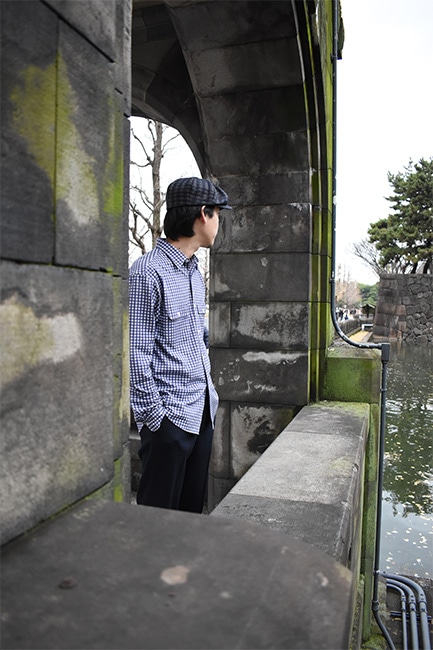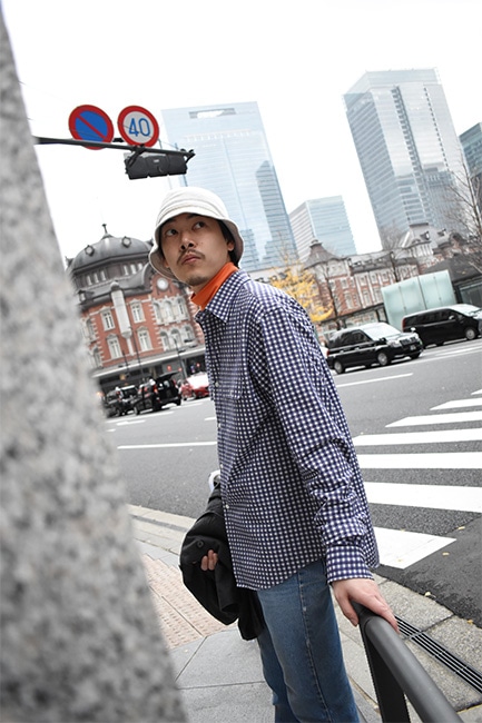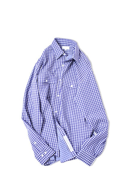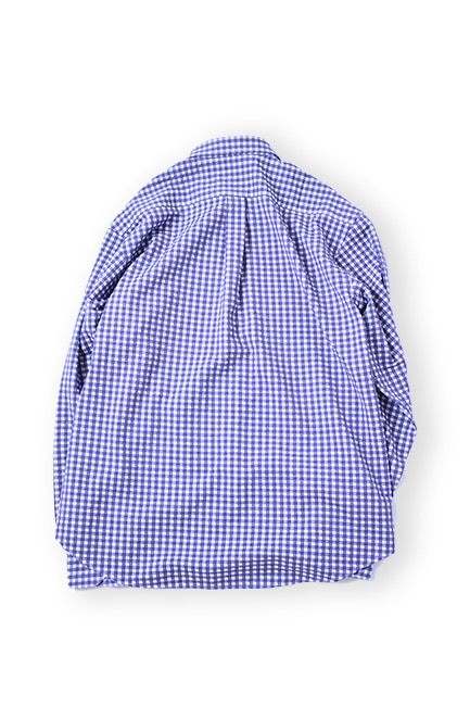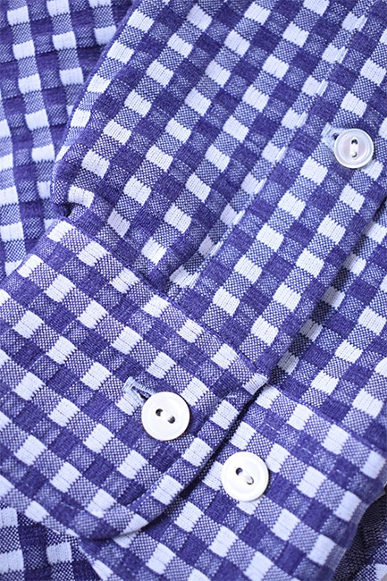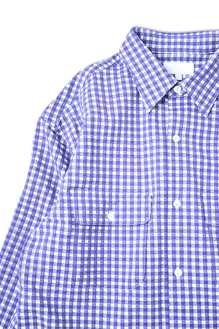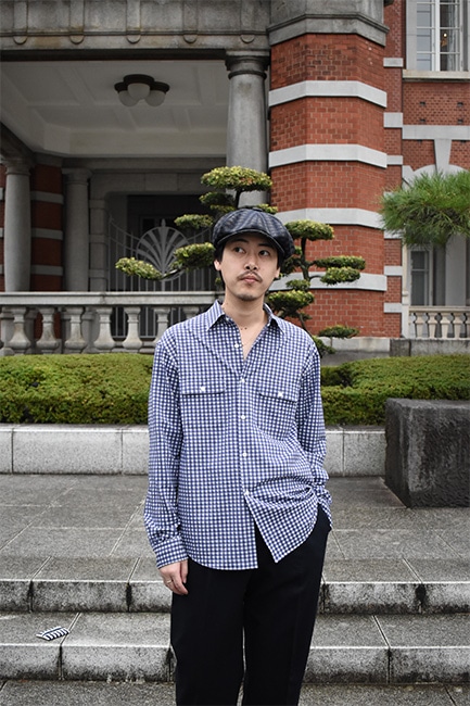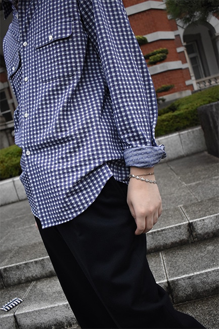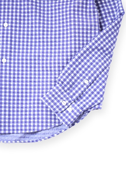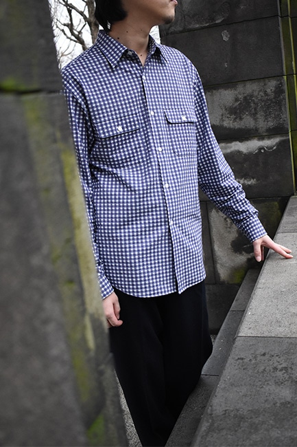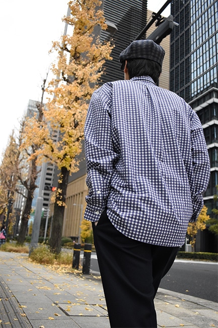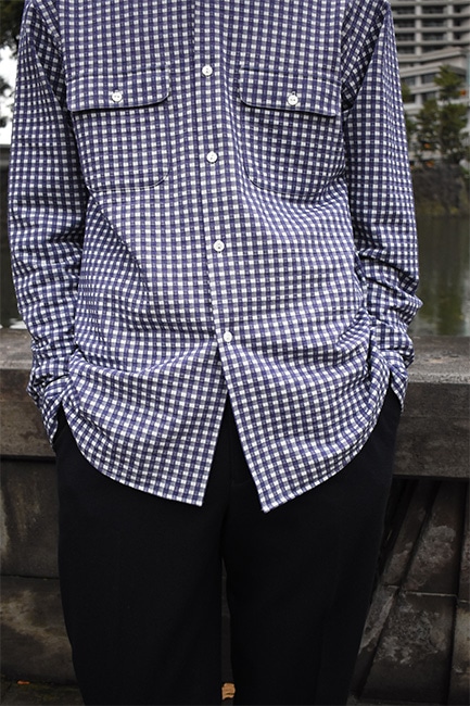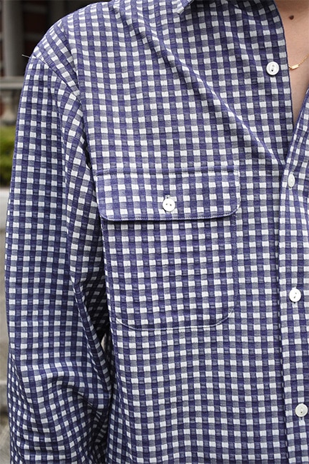スタッフ全員で話し合いを重ねて、決まったのがギンガムチェック。サンプルになるものを探していた時に、目に留まった某メゾンブランドのパープルギンガムがめちゃくちゃツボだったので満場一致で今回のものに決定。ギンガムにありがちなイナタさは上品な生地感とドレスシャツ縫製で違和感無く馴染む仕上がりに。