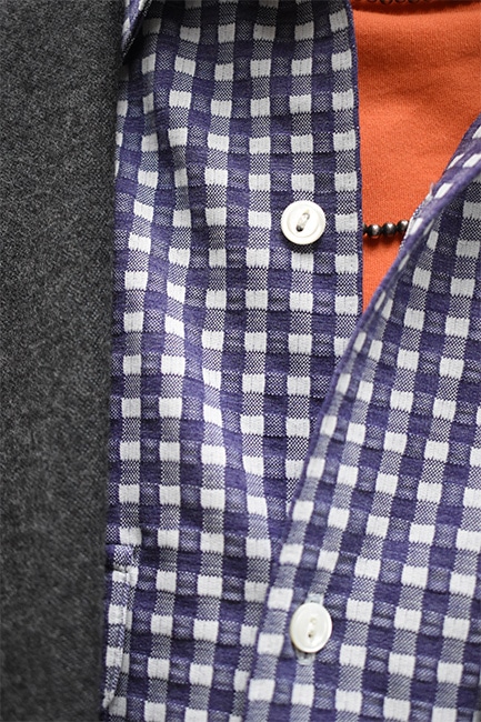 良い意味で想定外だったのが、熱を加え染める際に、ウール側が縮んでシボ感を生み出しており、ウールシアサッカーという不思議な生地が出来上がった事。肌離れがますます良くなり、着心地も最高になりました。柄に凹凸が出来て、表情のある独特なギンガムになっているので、是非店頭でご覧になって頂きたいところ。