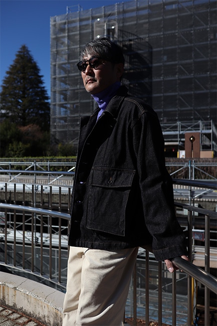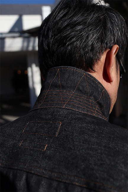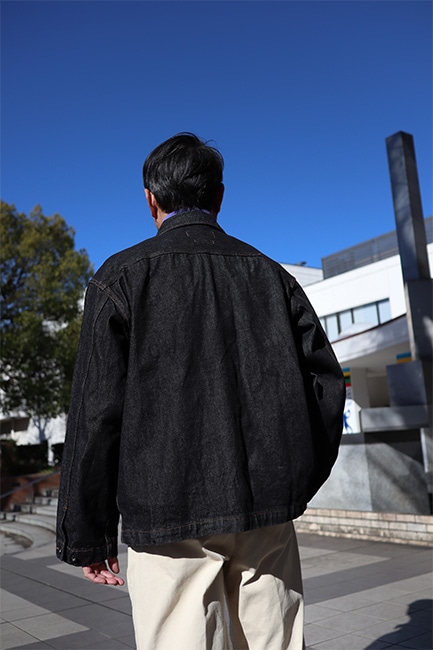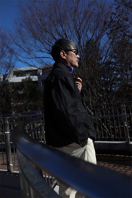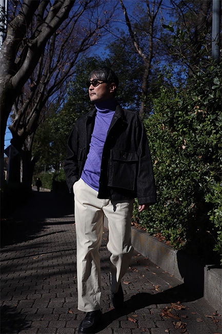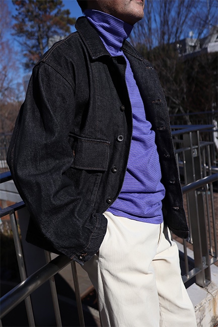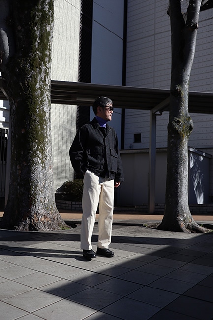 このジャケットを見て一発目に目に入るところって言ったらこの大きなフロントポケットですが、それだけではありません。襟を立てた時に見えるステッチワーク。なんて言ったら良いか分かりませんが、とにかく格好良い。出来れば襟を立てて着ていただきたい。アーム・身幅共にしっかりとゆとりを持たせているので、割となんでもサンドできます。今時期であればセーター着て、ダウンベスト着て、このジャケット。春時期は写真のように、薄コットンタートル仕込んで、パンツは爽やかに生成りの感じが良い。