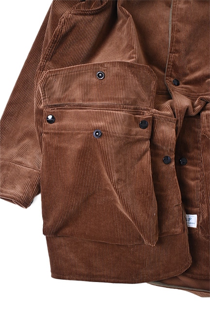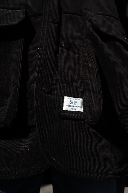 パッと見てすぐ目に入るのがフロントに配置された2つの大きなポケット。1つのポケットで3つ収納できるスペースがあり、胸元には2つ、バックには大きな3つのポケットに、内側に2つの計13個の収納スペース。大容量で、ガーデナー目線でいうと色々な道具と種が入る感じ。カバンを持たずにお出掛けしたいメンズの僕達にとっては物凄く有り難いです。容量もそうですが、この9Wのコーデュロイも艶があってエッチで格好良い。カリカリ硬めコーデュロイじゃなくて、しっとりしなやか系で肌触りは抜群。生地的にはそこまで厚みがある感じではないので、厳冬期はインナーに綿もの仕込んで、暖かくなればセーターの上にで大丈夫です。