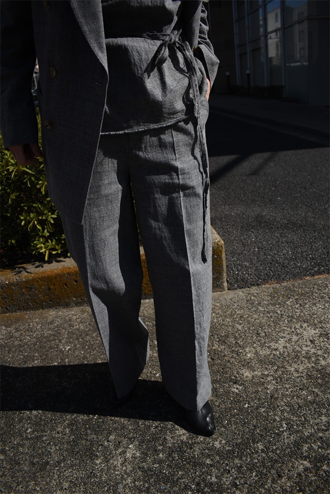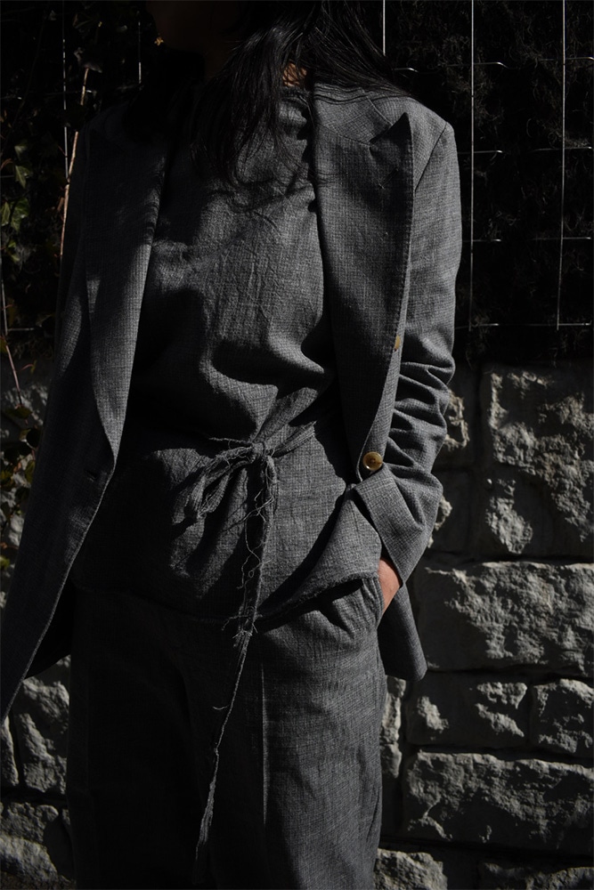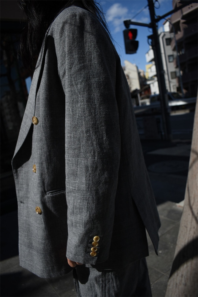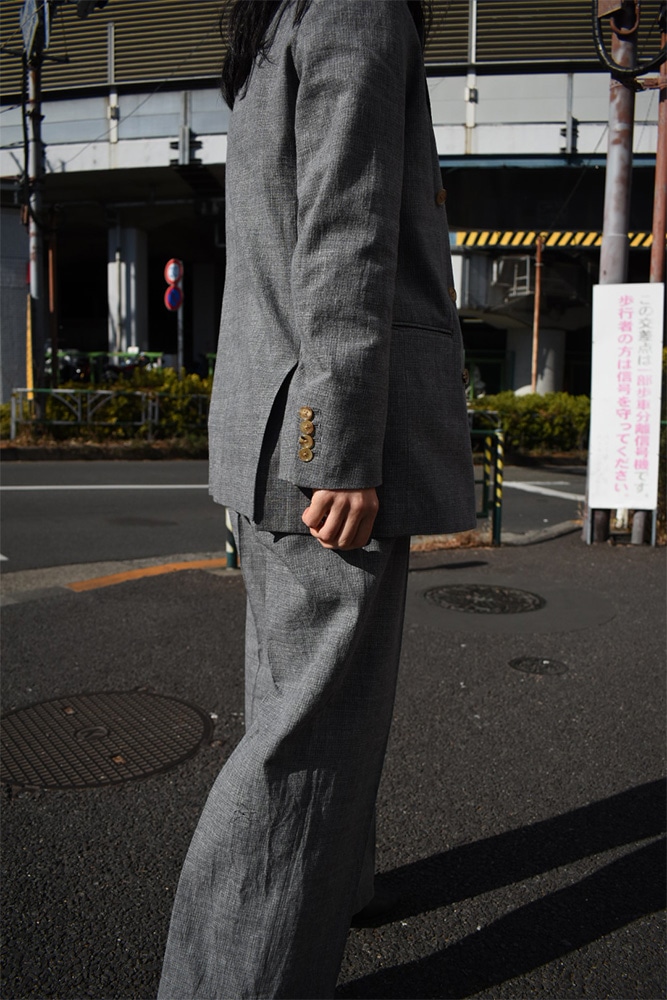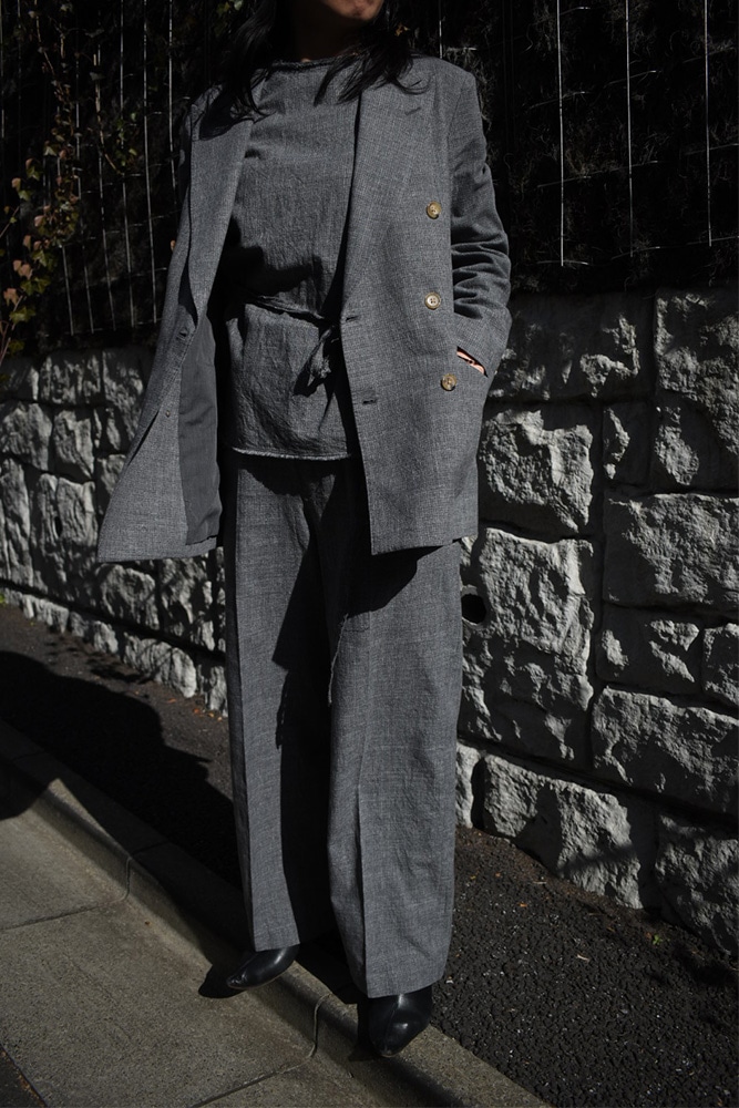 ダブルのジャケット、ノースリーブ、トラウザーズの3ピース。撚り杢や杢糸、落ち綿、ネップを含む先染め糸など複数の綿糸を使用し、ウールのような表情を持つコットン100%の生地に仕上げた独特な生地感。製品洗いを施し、自然なシワ感と生地表面の凹凸を引き出しています。ジャケットは、薄めのパッド、背抜き仕様、本切羽、水牛牡丹。ノースリーブは、裏表どちらでも着てもらえて、裁ち切りのデザインが素敵。トラウザーズは、ワンタック、股上から裾にかけての緩やかなテーパード。ボタンはジャケットと同じく水牛牡丹。写真の様に、少し高めのヒールブーツや、逆に平たいパンプスなんかを合わせてあげても素敵だと思います。