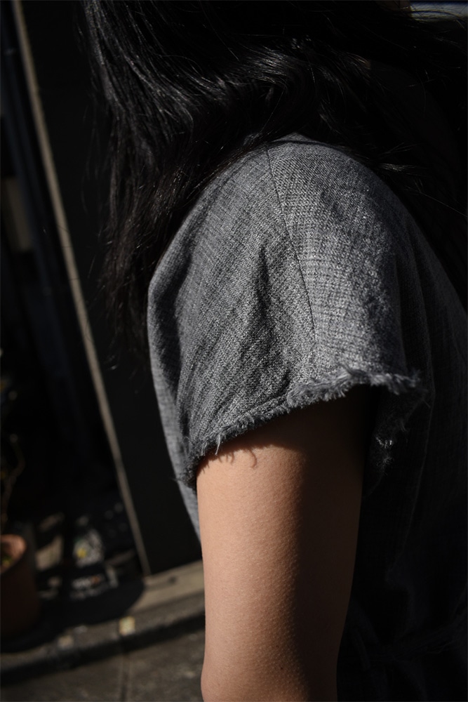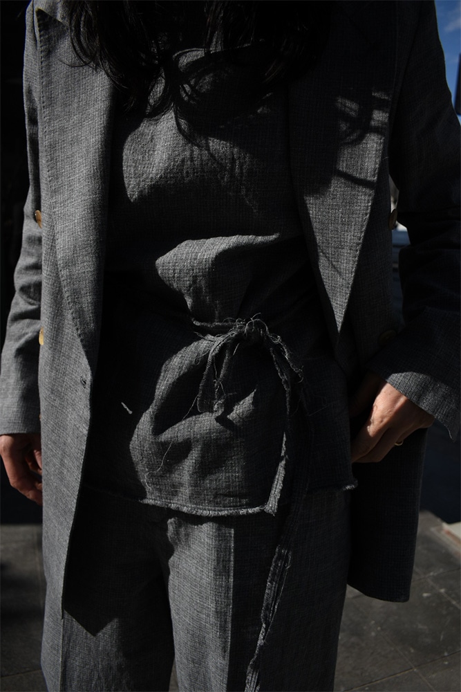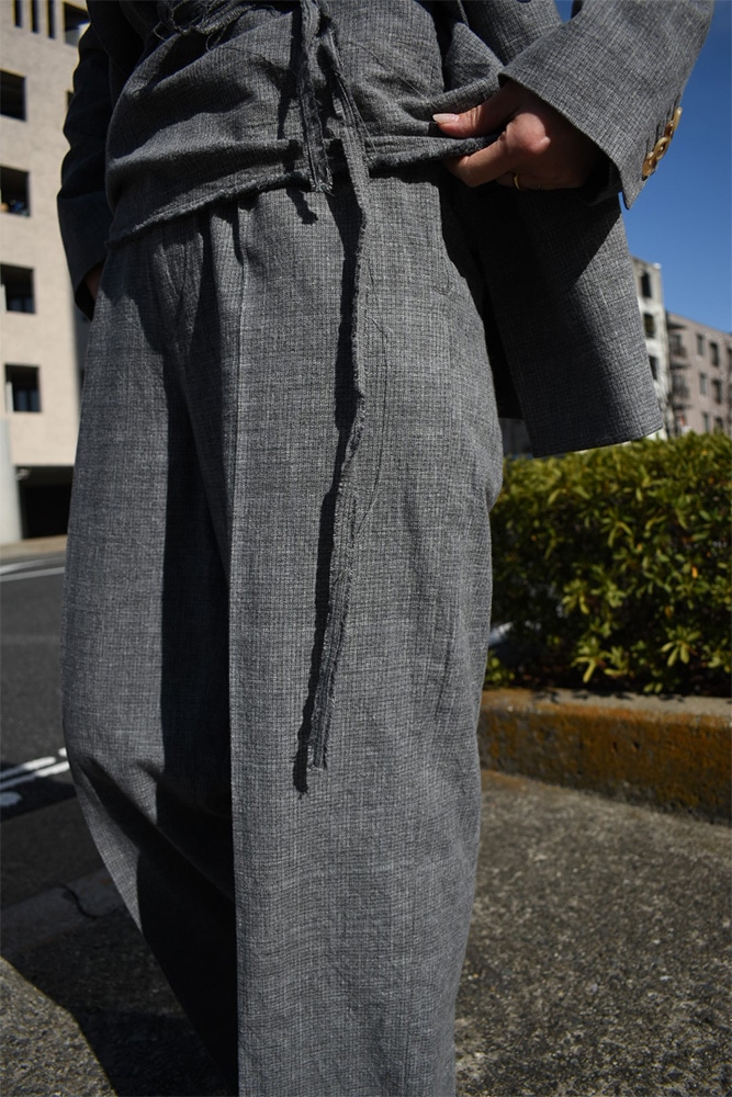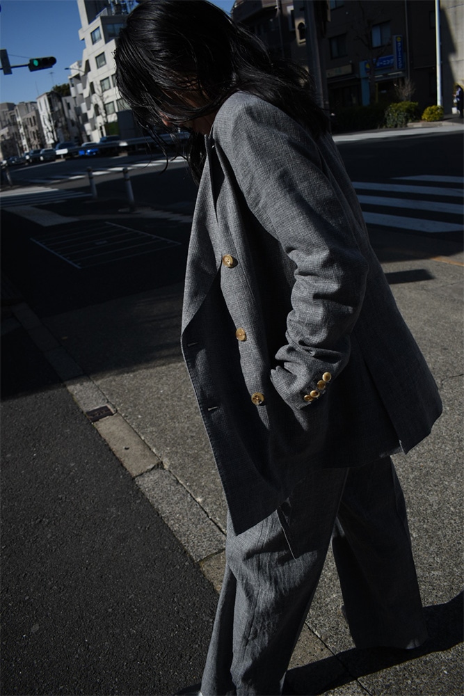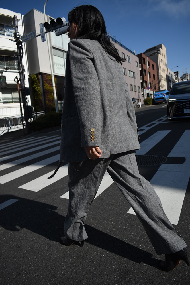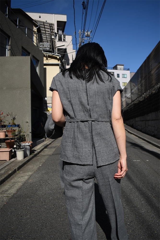 ダブルのジャケット、ノースリーブ、トラウザーズの3ピース。撚り杢や杢糸、落ち綿、ネップを含む先染め糸など複数の綿糸を使用し、ウールのような表情を持つコットン100%の生地に仕上げた独特な生地感。製品洗いを施し、自然なシワ感と生地表面の凹凸を引き出しています。ジャケットは、薄めのパッド、背抜き仕様、本切羽、水牛牡丹。ノースリーブは、裏表どちらでも着てもらえて、裁ち切りのデザインが素敵。トラウザーズは、ワンタック、股上から裾にかけての緩やかなテーパード。ボタンはジャケットと同じく水牛牡丹。写真の様に、少し高めのヒールブーツや、逆に平たいパンプスなんかを合わせてあげても素敵だと思います。