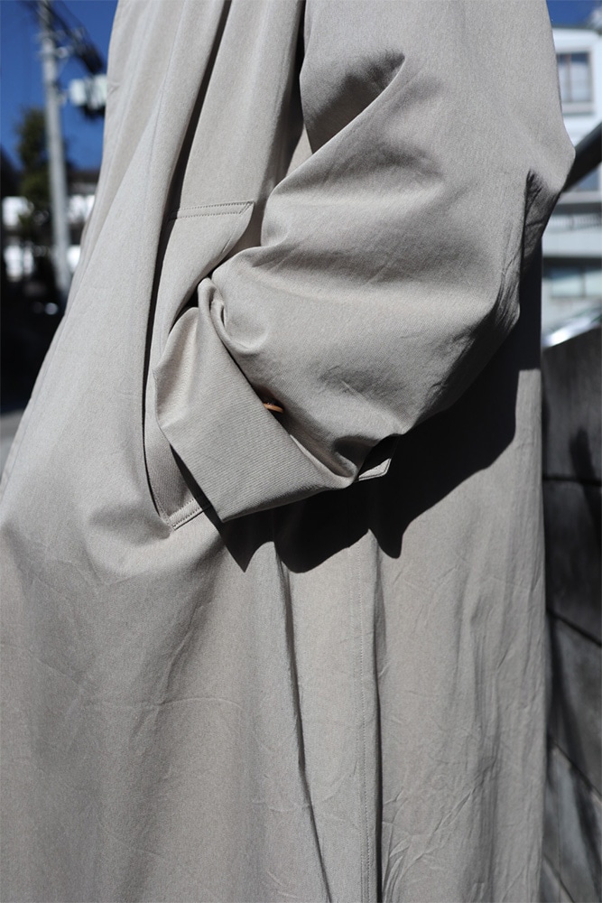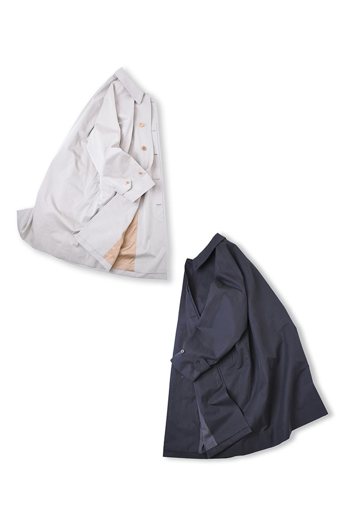 今シーズンの春ウォーカーコートは2色。生地違いでセレクトしています。トープが、超長綿GIZAとSUPIMAの細番手杢糸を用いた新作ギャバジン素材。シャンブレー組織で高密度に織り上げている。洗い晒しのナチュラルな風合いが魅力的。ブラックが、タテ糸にコットン65、ヨコ糸にナイロン35を使い超高密度に織り上げたコットンナイロンツイル。あのロクヨンでお馴染みのブランドはタテにナイロン、ヨコにコットンなので、真逆です。混率だけ見ればアメリカンアウトドアっぽい、でも形はフランス製のコートをリファレンスしたものっていうのが良い。二つとも独特なタッチで、言葉に表すのは難しいので、是非店頭で試してみて欲しい。