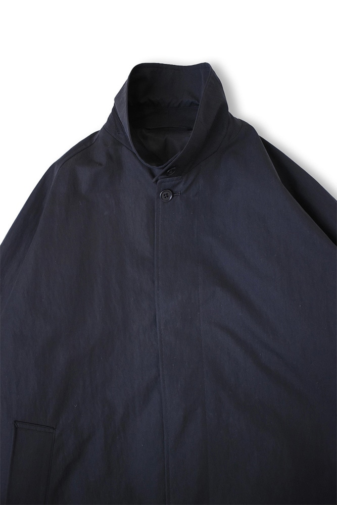 2020年の登場以来、キャプテン サンシャインの秋冬のスタンダードとなったバルマカーンコート。ゆったりとしたAラインで、蹴廻し(裾周り)を大きく採ったパターンは足さばきの良さと、自然で上品ななびき方が楽しめる。襟はやや小さめで、立てて着た際には肩傾斜を強めた前振りのラグランスリーブにかけて美しいラインが生まれるよう設計されている。