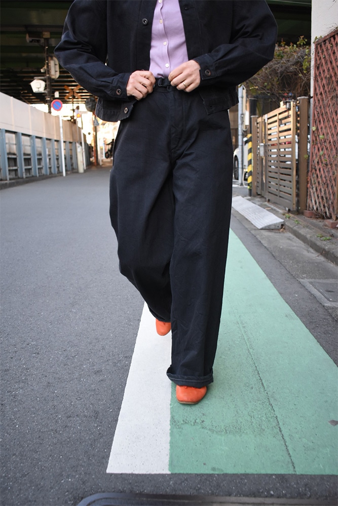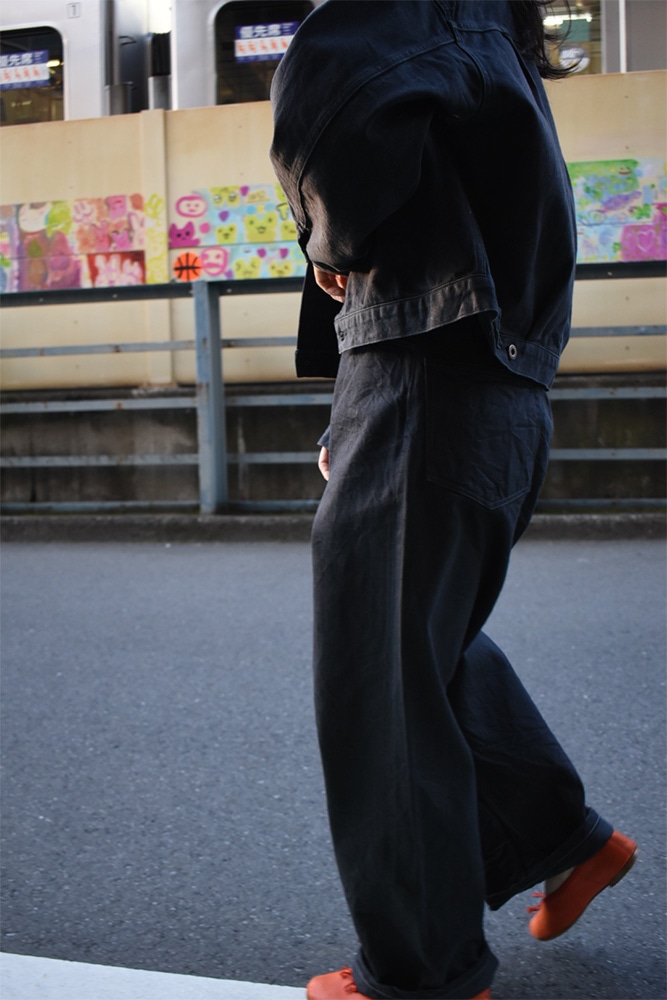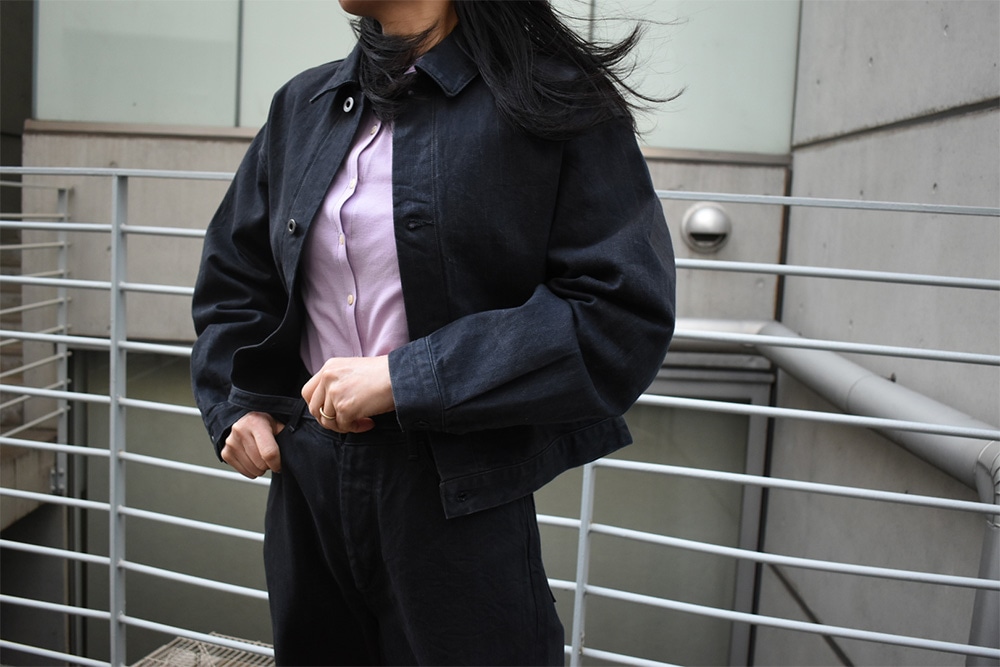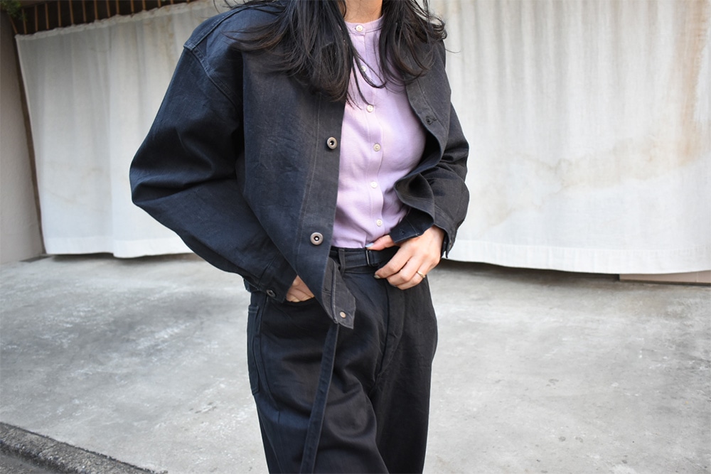 ワンウォッシュをかけているので、ここから物凄く縮みが入る事はありません。最初から柔らかく、着心地も抜群。ジャケットは、身幅広め着丈短めのバランスで、パンツはほぼストレートくらいのシルエット。セットアップで着用するとスタイルがかなりよく見えます。体のシルエットが出ず、パンツのお尻周り問題は、ゆとりを持たせているので気にする事なく着用して頂けるかと。こんな可愛いセットアップを彼女とか奥さんに着て欲しい。