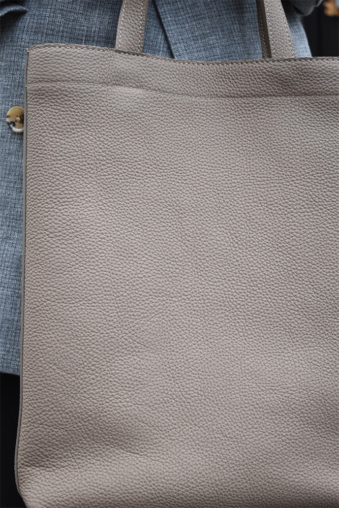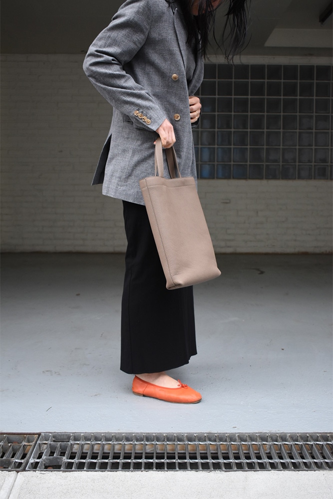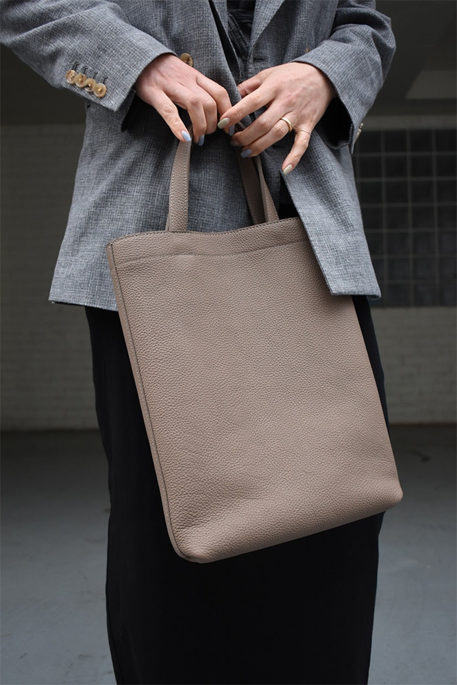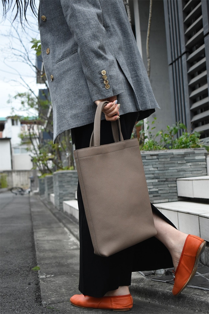 MANOUTILといえばのドイツシュリンクを使用し、別注としてA4 Tote型を製作して頂きました。「分厚いけどしなやかで、薄い革だと角張った感じになりますが、ドイツシュリンク特有の厚みを生かし、厚みがあるからこそ裏地無しでもコロンとした可愛らしいフォルムに仕上がります。」と、麻子さん談。堅牢で傷が目立ちにくく、雨の日でも気兼ねなく使える。そのうえ、使い込むほどに艶を増していく美しい革です。