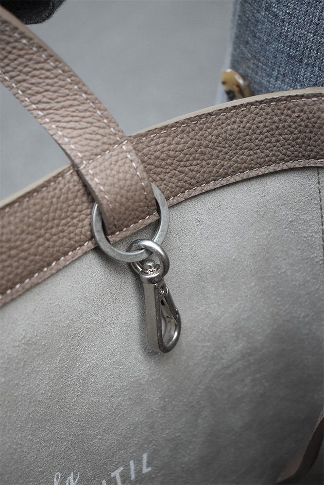 A4 Tote型なので、13インチのノートパソコンがすっぽりと入るくらいのサイズ感で、少し出かけないといけないけどそんなに荷物は持ちたくないなという方には完璧なサイズかと。ハンドル部は長さを調節できる為、手持ち、ワンショルダーの2通りで使って頂けます。ハンドルの片側にはナスカンが付いている為、キーケースや、お気に入りのチャームとかを付けてアレンジしてみて下さい。