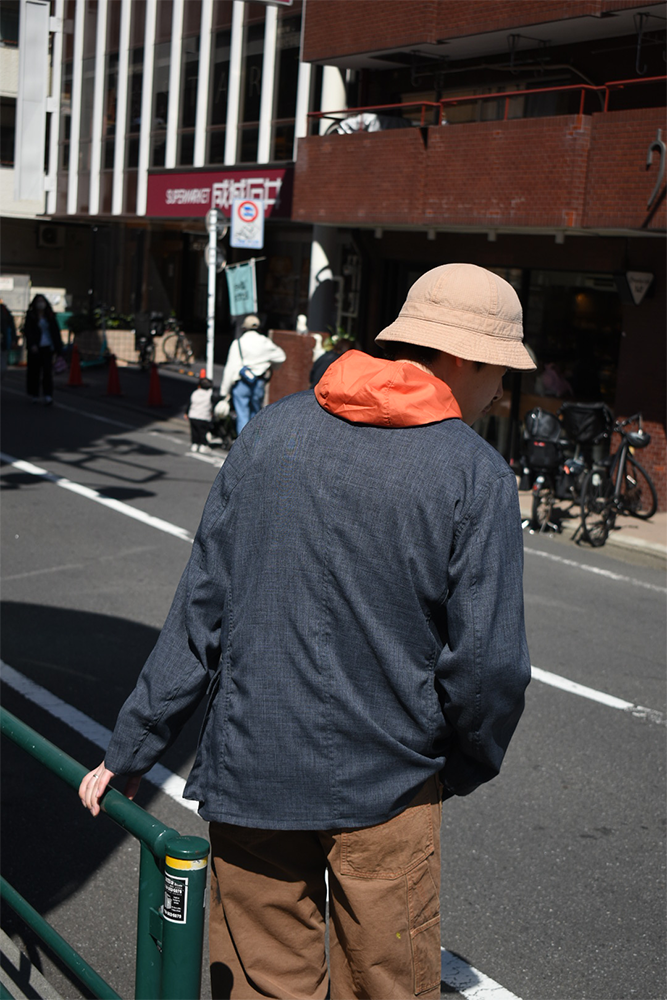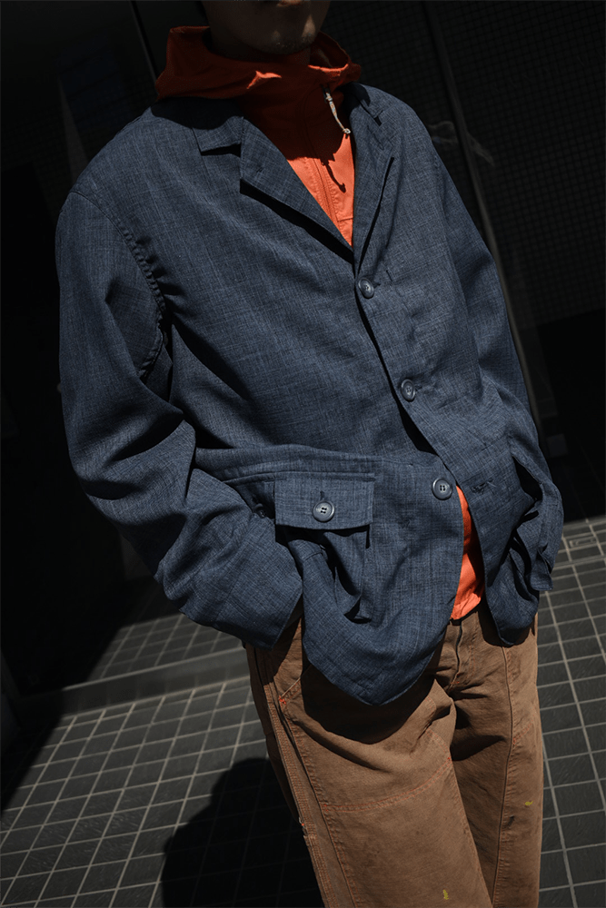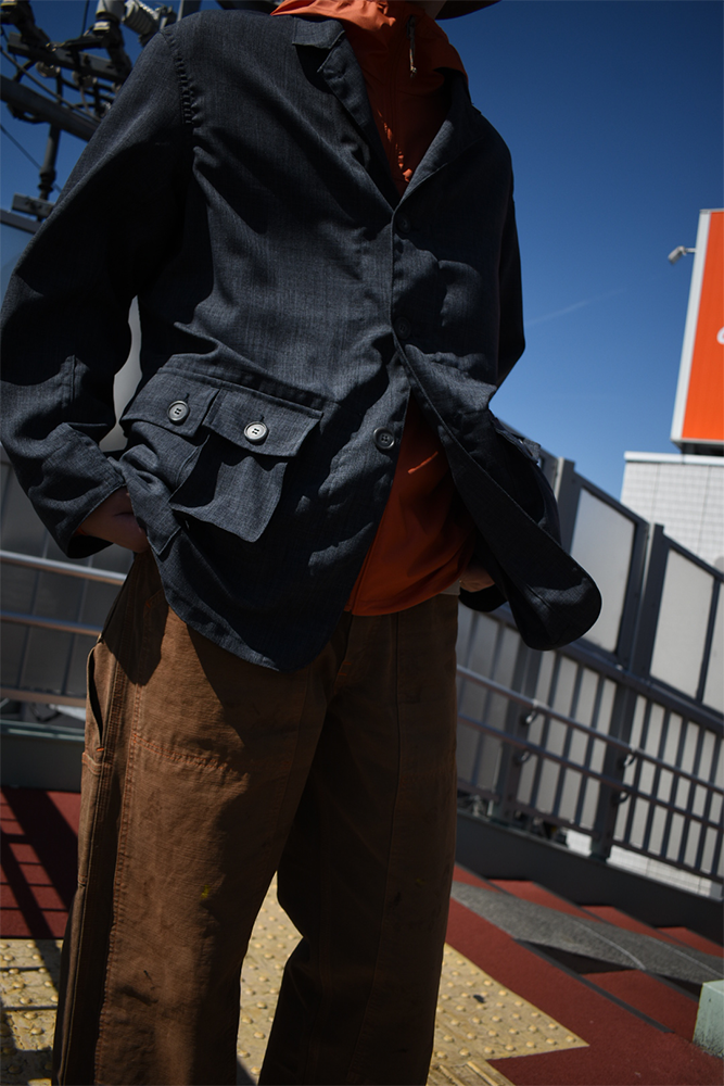 WOOLINOと言われる生地を採用。ウールに見えますが、実は撥水性のあるポリエステル生地。軽くて、サラッとしてて肌に当てても化繊の嫌な感じはなし。イージーケアな点もGOODです。インナーはドレスシャツを挟んでもカチカチに見えないし、写真みたいにパタゴニアのナイロンを挟んでもカジュアルになりすぎない。本当に優秀。