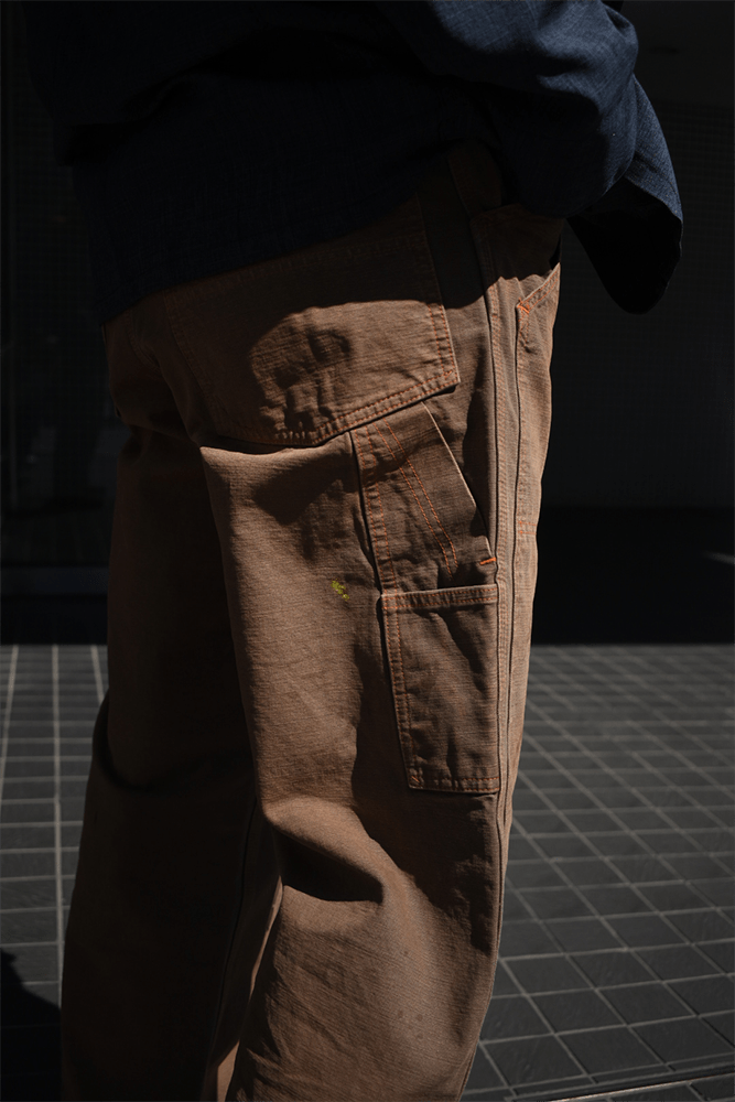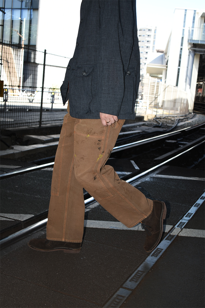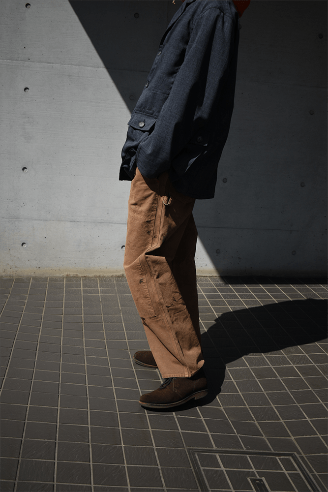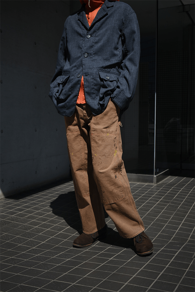 このパンツが吠えてました。前見頃全体を覆うような構造の重労働向けの無骨なダブルニー。擦れや汚れ、褪色の重なりなんかのリアルな加工感は、ブランドの得意とする所。実際に現場で使い倒されてきたような佇まい。やらしくないくらいにオレンジステッチを合わせて。