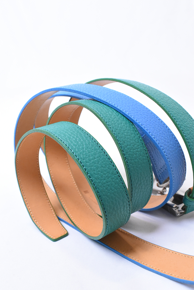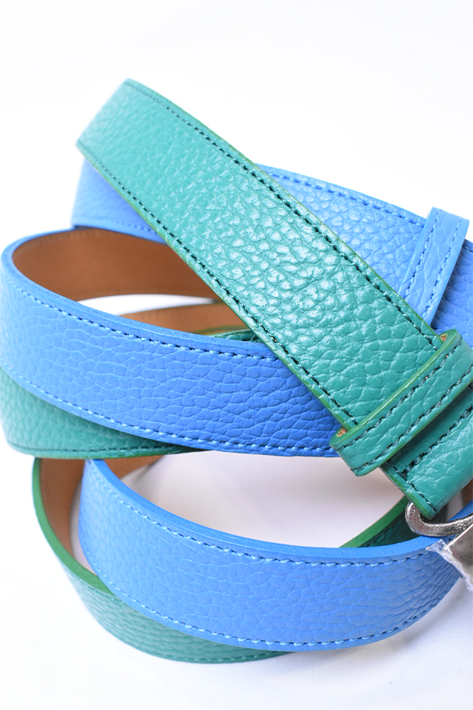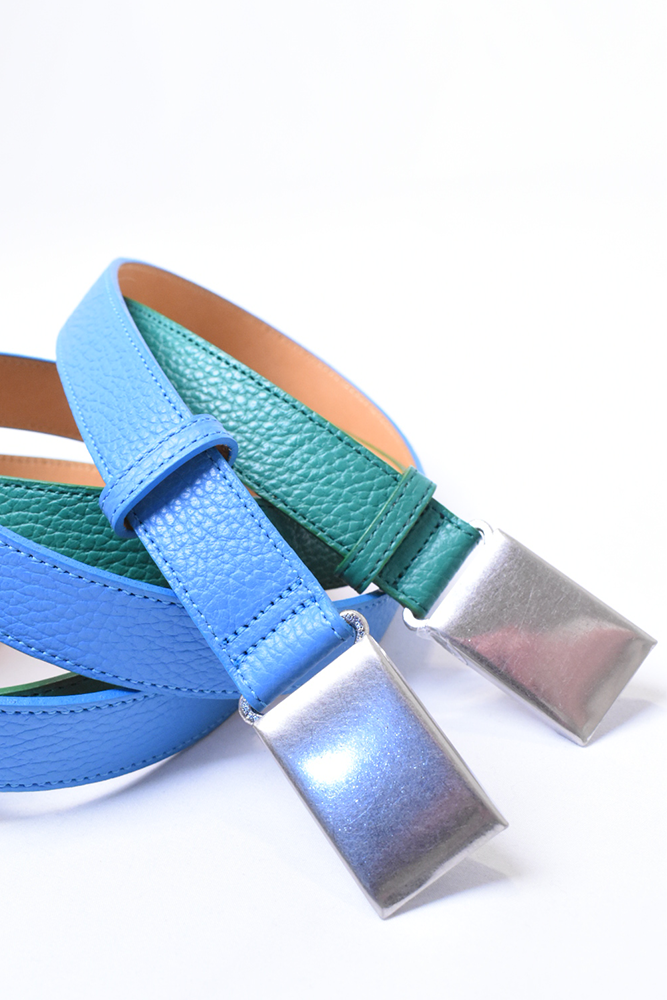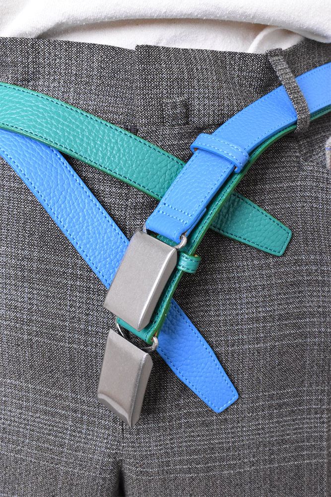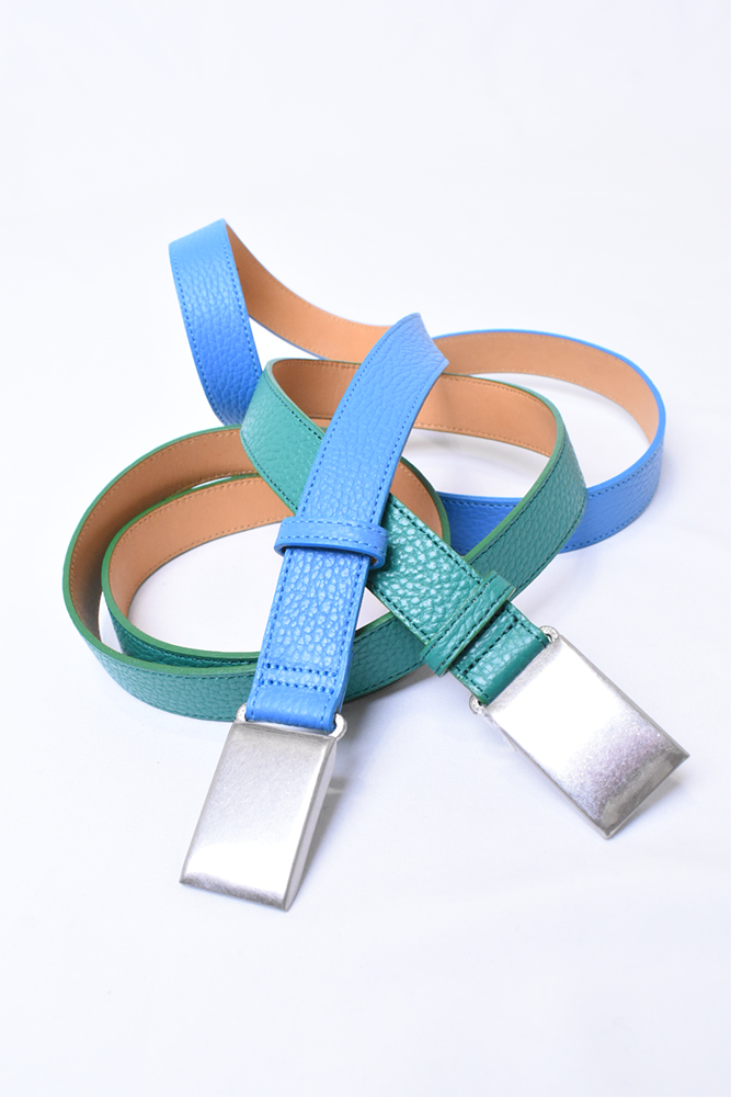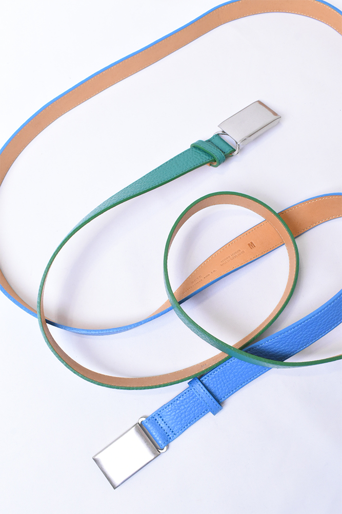 簡素化してしまう夏のスタイリングは本当に面白くない。何か一つお気に入りの洋服を着ておしまいみたいなあの感じが寂しくてたまらない。だったら腰元に大人の茶目っけをプラスオンしようという考えで作りました。メンズ服のベルトの選択肢って本当に少ないと思っていて、黒か茶で、バックルに特徴があるかないかのものくらいしか無いので、飽きてしまうんですよね。そこに殴り込みを掛けようということで、緑と水色の2色を。元々、インラインで緑と水色が出ていて、「これめっちゃ良いなー。」って皆んなで話していました。そこに弊社代表木村が来て、「なら、次の別注は色物でやったら良いんちゃう?」って。しっかりやらせて頂きました。ウィメンズぽくなりすぎない為に、艶消しのシルバーバックルに、Kelly GreenとSky Blueのシュリンクレザー。アイルランドの豊かな自然に青い空。なんだか凄く心が穏やかな気持ちになってきそうな2色は、腰元に持ってきてあげても、いやらしさがなく、すんなりと馴染んでくれます。