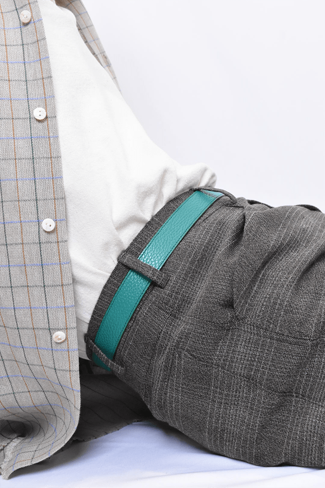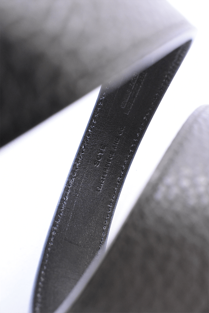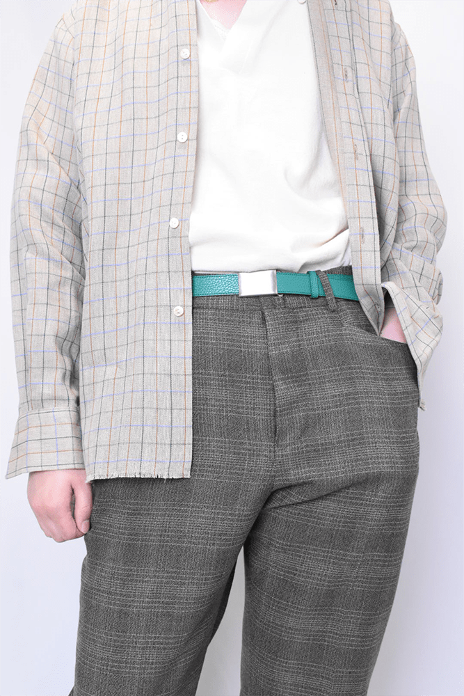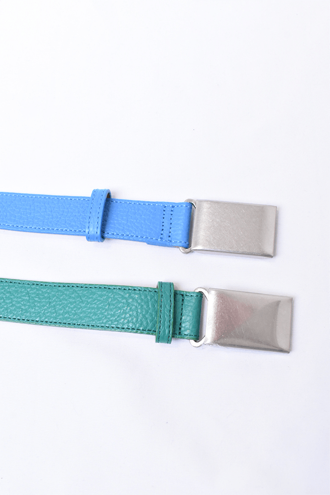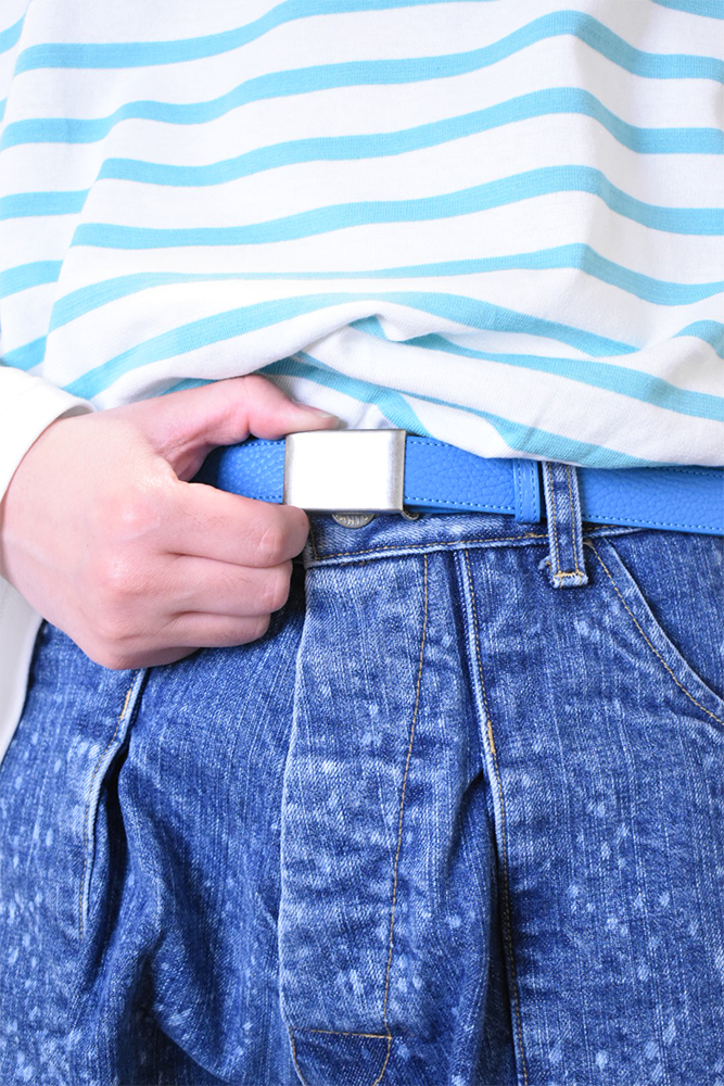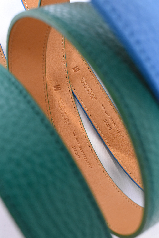 簡素化してしまう夏のスタイリングは本当に面白くない。何か一つお気に入りの洋服を着ておしまいみたいなあの感じが寂しくてたまらない。だったら腰元に大人の茶目っけをプラスオンしようという考えで作りました。メンズ服のベルトの選択肢って本当に少ないと思っていて、黒か茶で、バックルに特徴があるかないかのものくらいしか無いので、飽きてしまうんですよね。そこに殴り込みを掛けようということで、緑と水色の2色を。元々、インラインで緑と水色が出ていて、「これめっちゃ良いなー。」って皆んなで話していました。そこに弊社代表木村が来て、「なら、次の別注は色物でやったら良いんちゃう?」って。しっかりやらせて頂きました。ウィメンズぽくなりすぎない為に、艶消しのシルバーバックルに、Kelly GreenとSky Blueのシュリンクレザー。アイルランドの豊かな自然に青い空。なんだか凄く心が穏やかな気持ちになってきそうな2色は、腰元に持ってきてあげても、いやらしさがなく、すんなりと馴染んでくれます。
