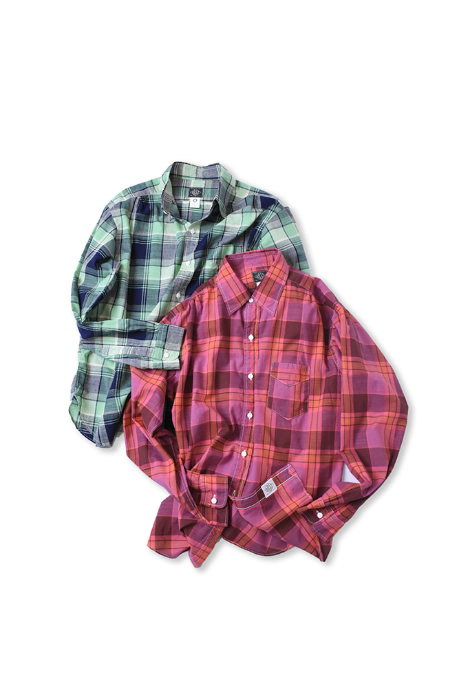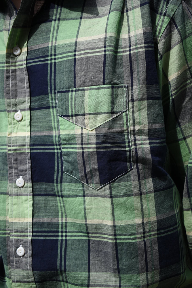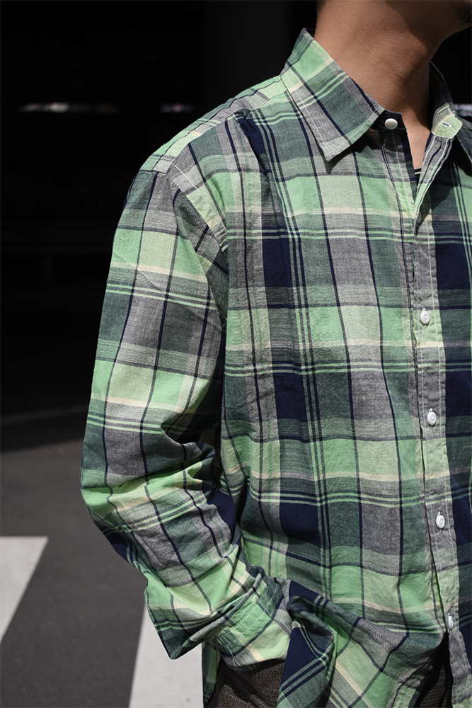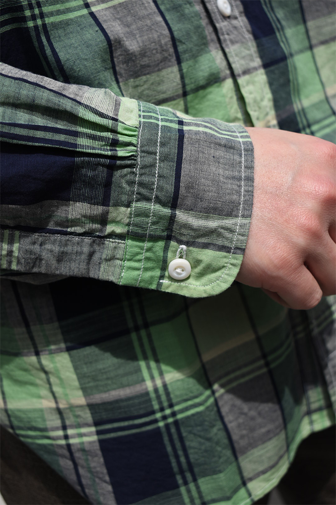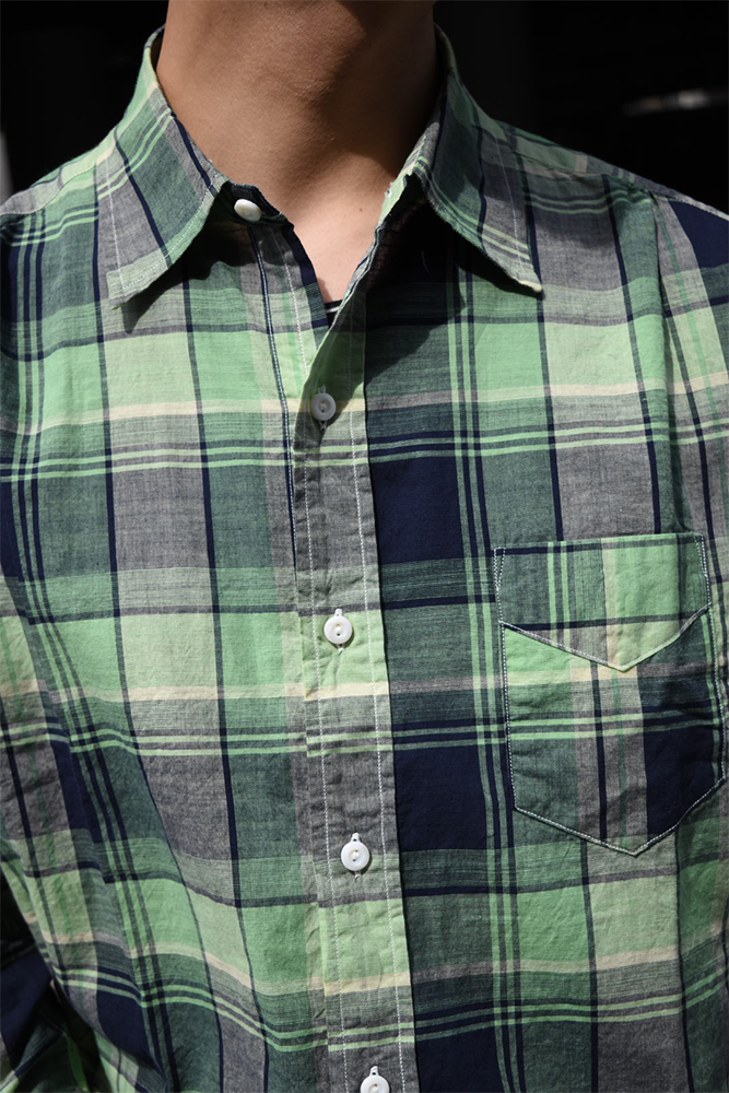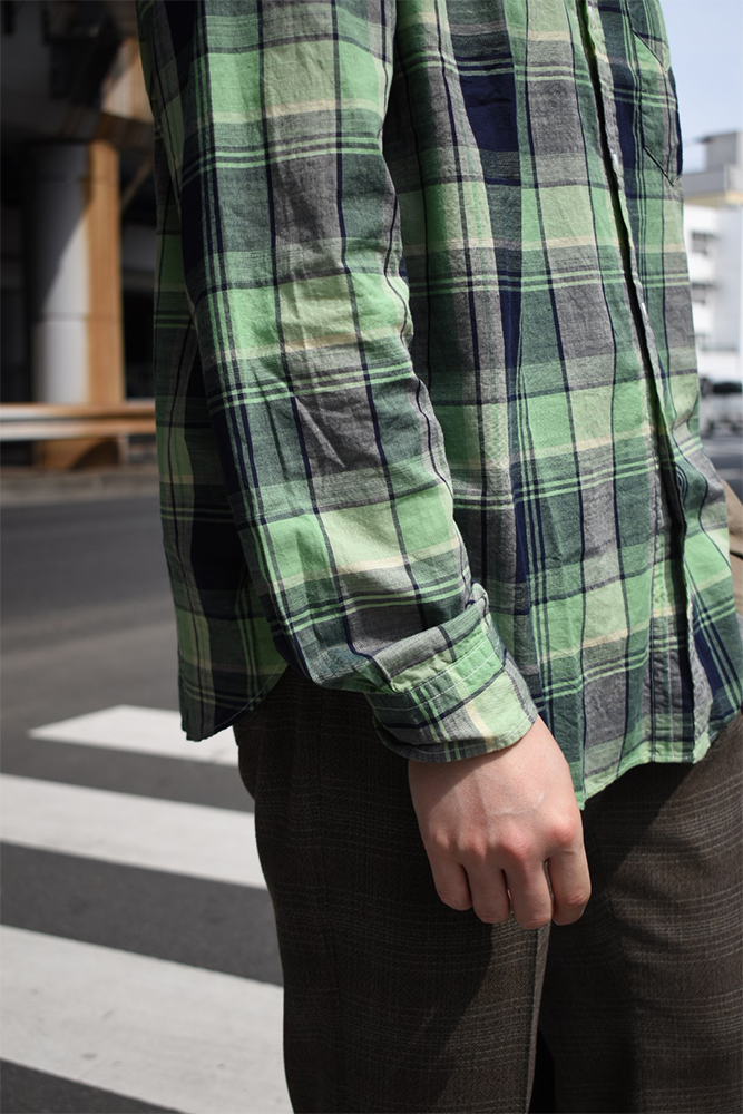 インドのカディのように手触りが良く、薄く軽い生地なので、これから始まる長い夏のお供として最適ですね。日除でこのシャツを羽織って、インナーにはお気に入りのTシャツやタンクトップを着てみて下さい。それだけで様になります。ちなみに、洗い晒しにしてシワが入っていてもカッコいいので、神経質にならなくてもOKです。