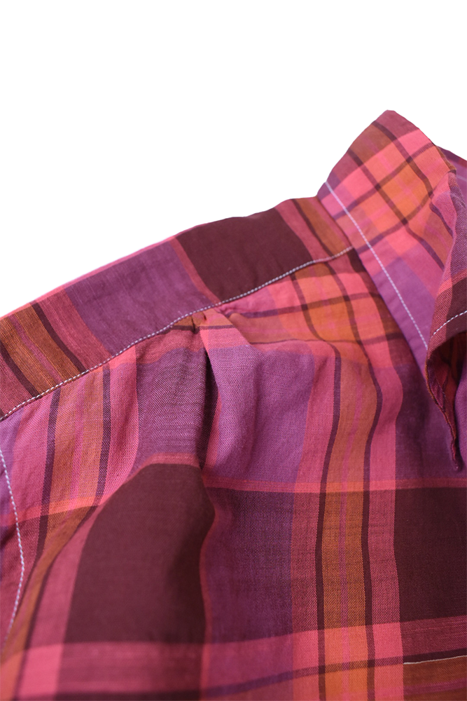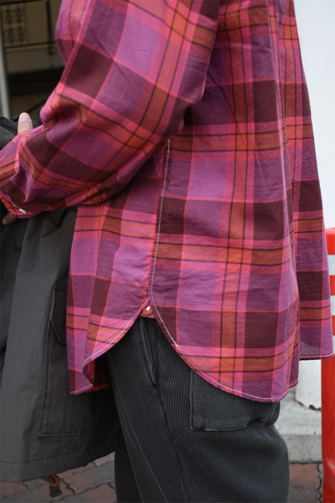 肩周りにギャザーを入れて、立体的に仕上げている縫製にも注目して欲しいです。なで肩もイカリ肩も優しく包んでくれる本当に着やすいシャツ。せっかく良いチェックなのに体型のせいで似合わないなんて事はありません。