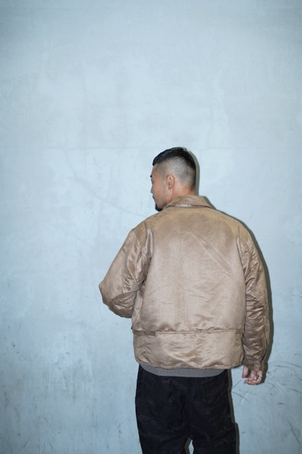 1980年代のWillis&Geiger 製G-8 Flight Jacketをモチーフに制作されたこのジャケットは大きな2つのフロントフラップポケット、大ぶりなジップ、ダイヤ型のエルボーパッチ。