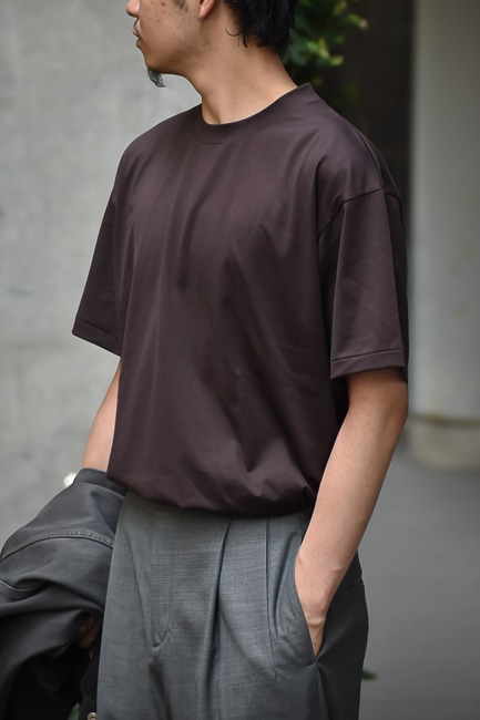 インドの大地で丁寧に手摘みされたSUVIN COTTONを、和歌山市の熟練のニッターが編み上げ、双糸に仕立てたオリジナルジャージー素材を使用した極上のカットソー。