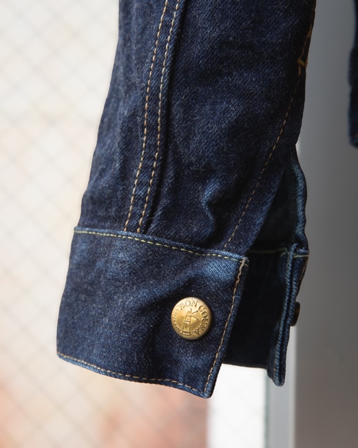 経糸(たていと)はインディゴ染料でロープ染色した中白状態のモノ。