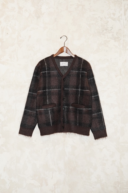 ネルシャツに用いられたチェック柄をデザインとして落とし込んだモヘアカーディガン。