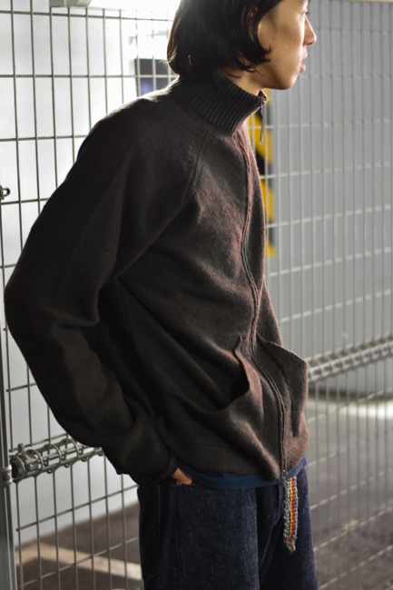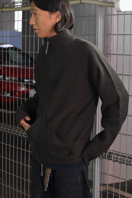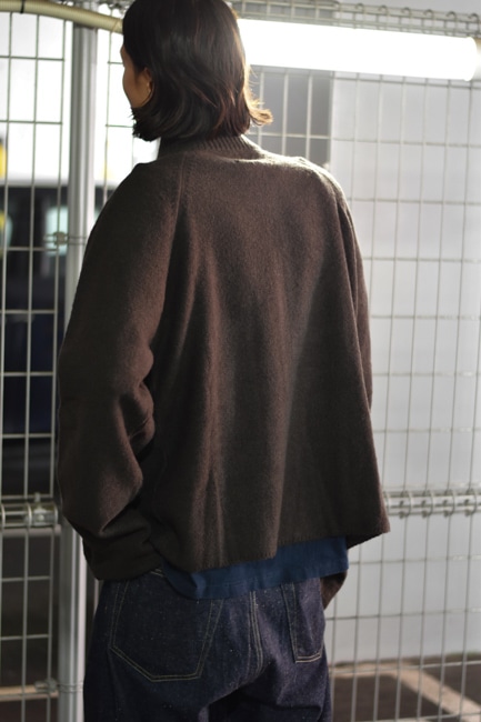 袖口や裾のリブは排除され、襟元のみリブ編みになっており