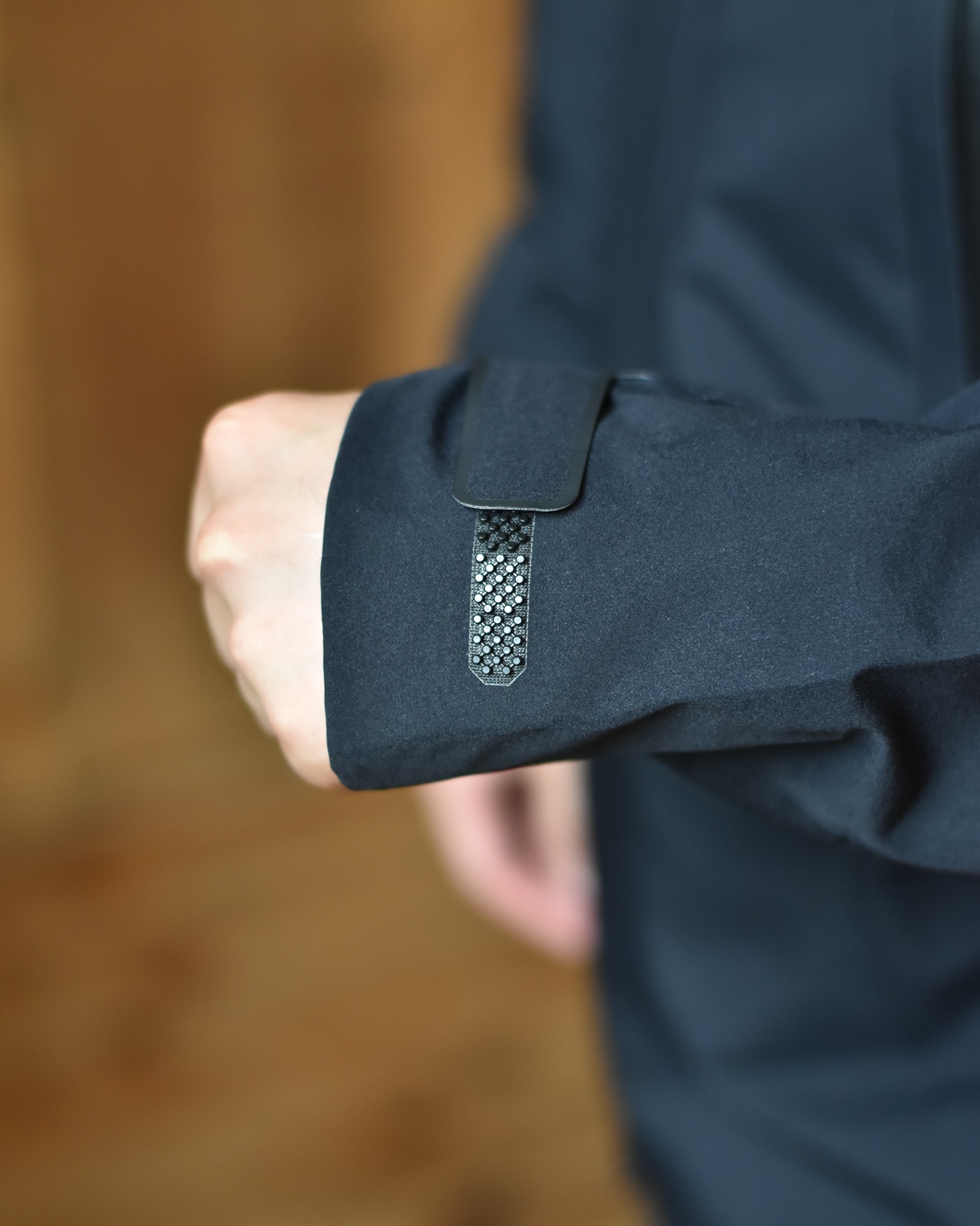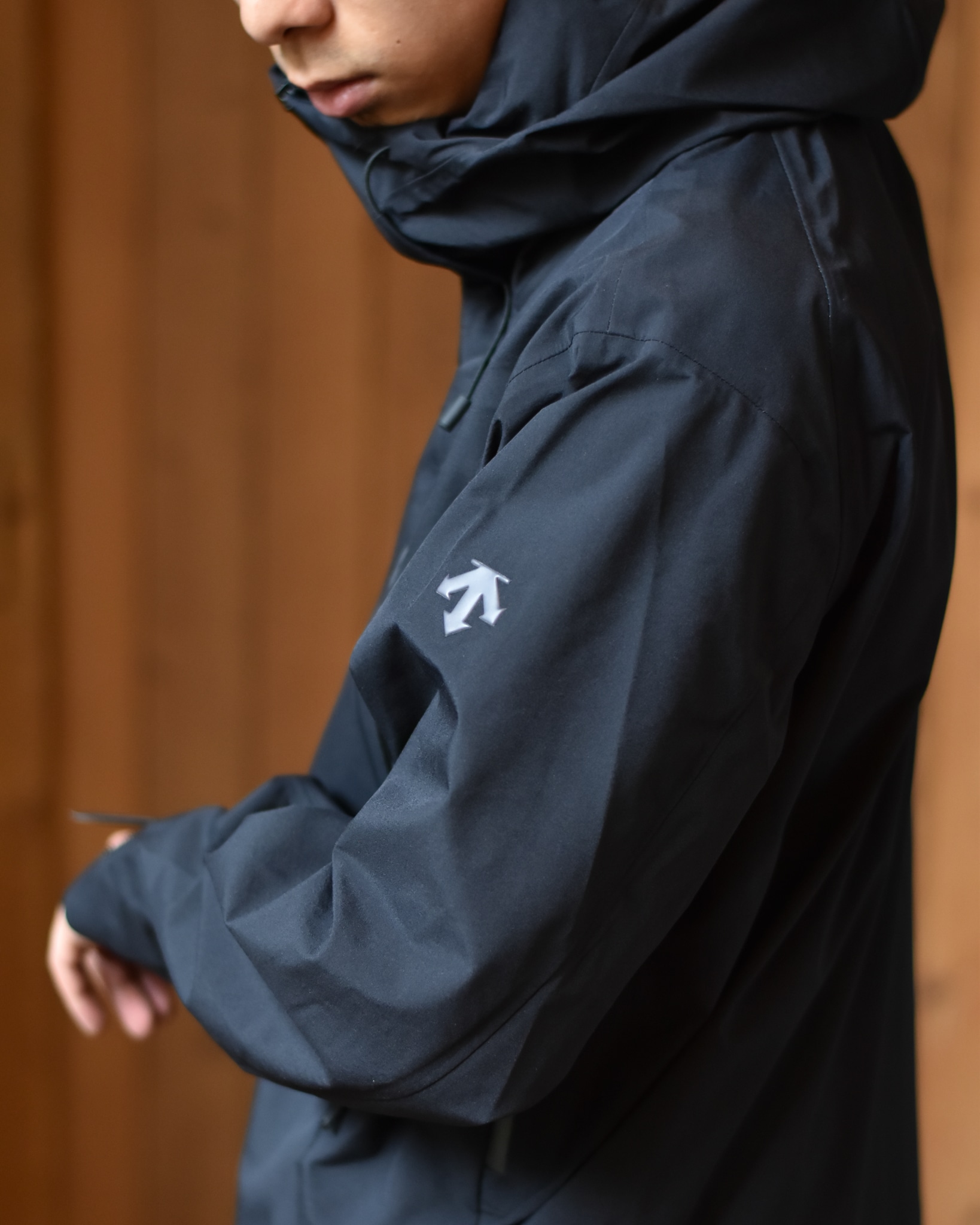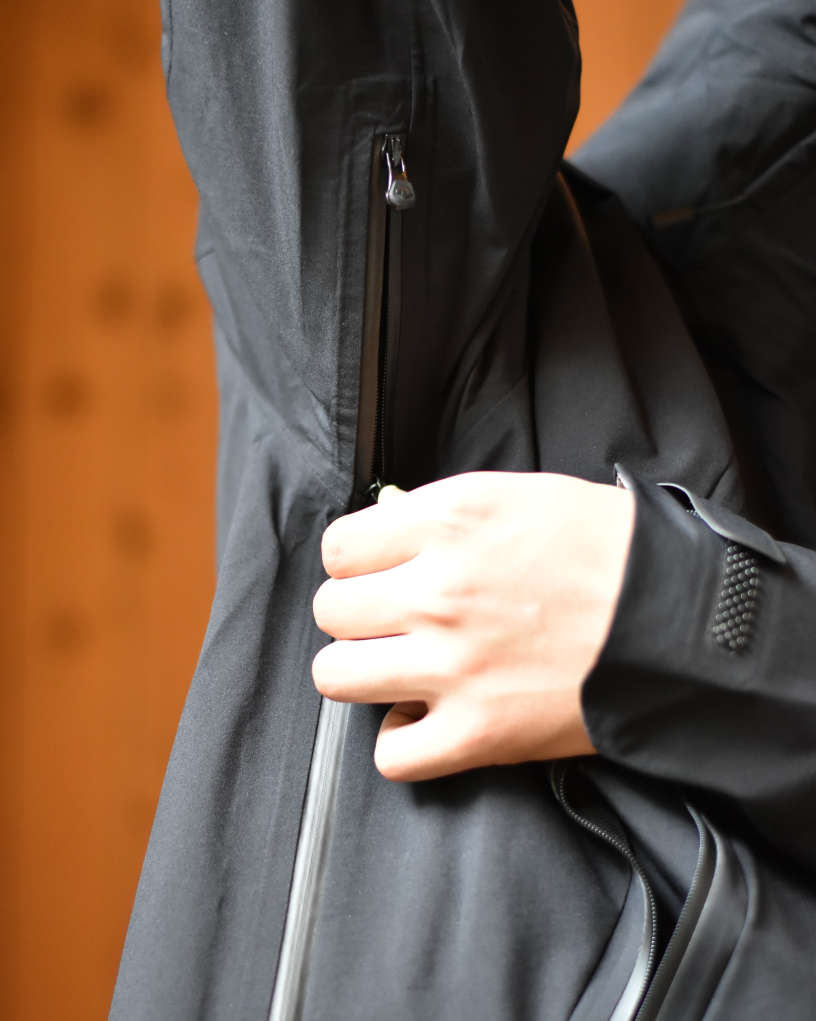 装備できるパラフードシステム、袖口には雨の濡れにもお構いなしなブロックフィットアジャスター