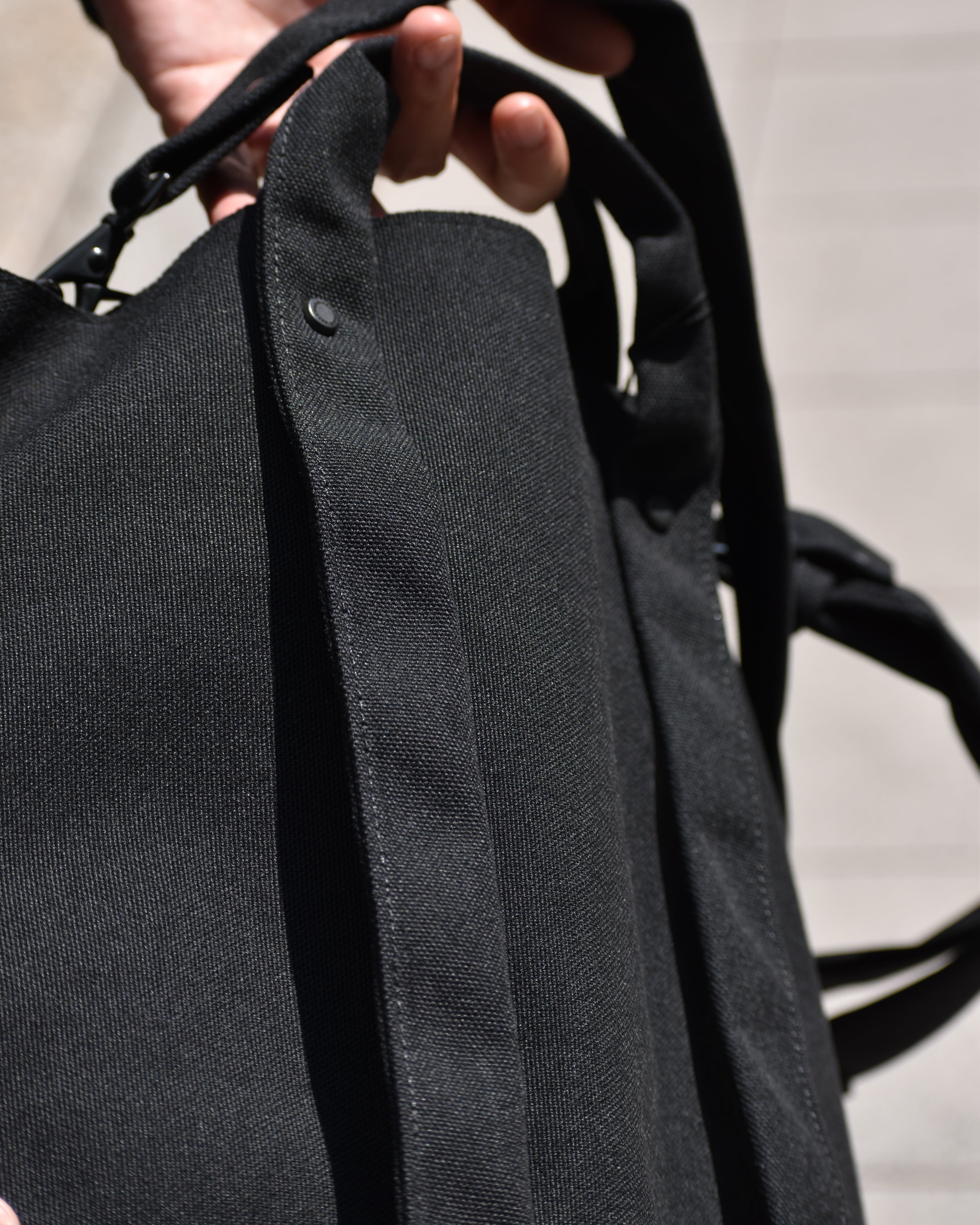 リサイクルポリエステル糸を旧式のシャトル織り機にてゆっくりと時間をかけて織り上げた帆布素材は耐久性は言わずもがな、汚れが付着しにくく水拭きで基本対応可能。