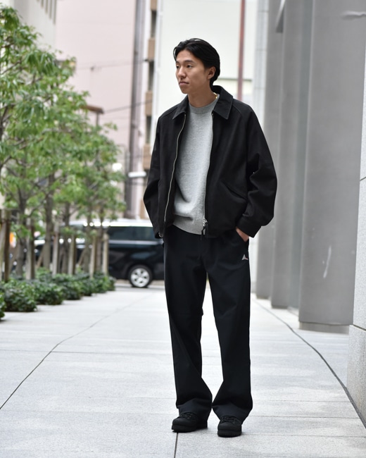 着やすいジャケットの形だけに、インナー、パンツは選びやすいかと思いますが、今回は異素材でスタイリングを組みました。
